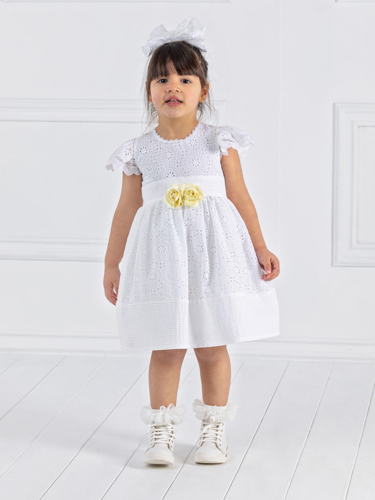 Κομψό φόρεμα με έξω πλάτη από βαμβακερή δαντέλα "Broderie", στρογγυλή λαιμό κόψη και κοντά μανίκια. Είναι διακοσμημένο με ριγέ βαμβακερό ύφασμα nervir στη μέση και τη φούστα. Το ντύσιμο ολοκληρώνεται με διακοσμητικά κίτρινα λουλούδια στο μπροστινό μέρος. Εξαιρετική επιλογή για την ημέρα της βάπτισης αλλά και για άλλες στιγμές.