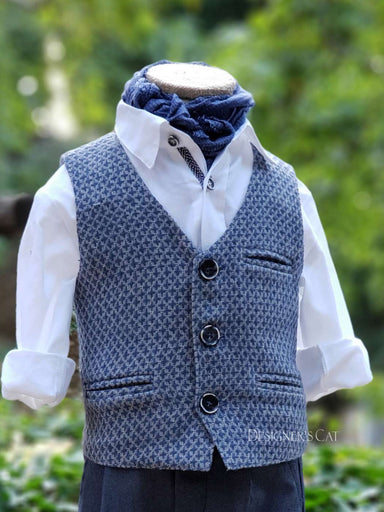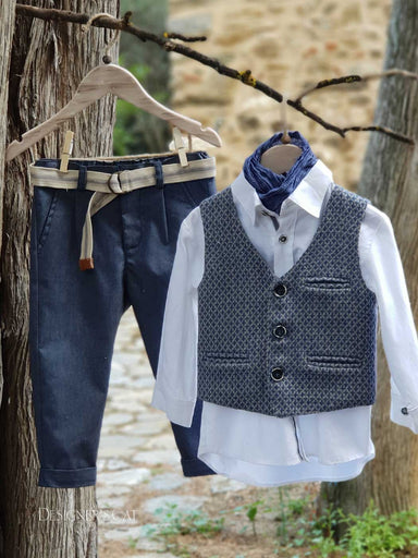 Κομψό ,μοντέρνο σετ βάπτισης εξαιρετικής ποιότητας ,αποτελούμενο από σύμμεικτο jacquard γιλέκο και βαμβακερό παντελόνι σε ίσια γραμμή. Το σύνολο συ...