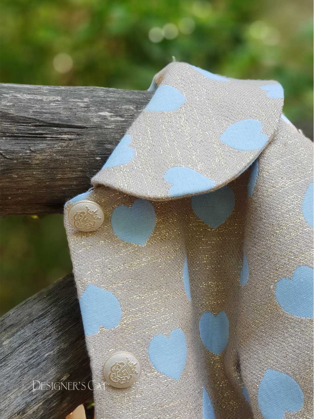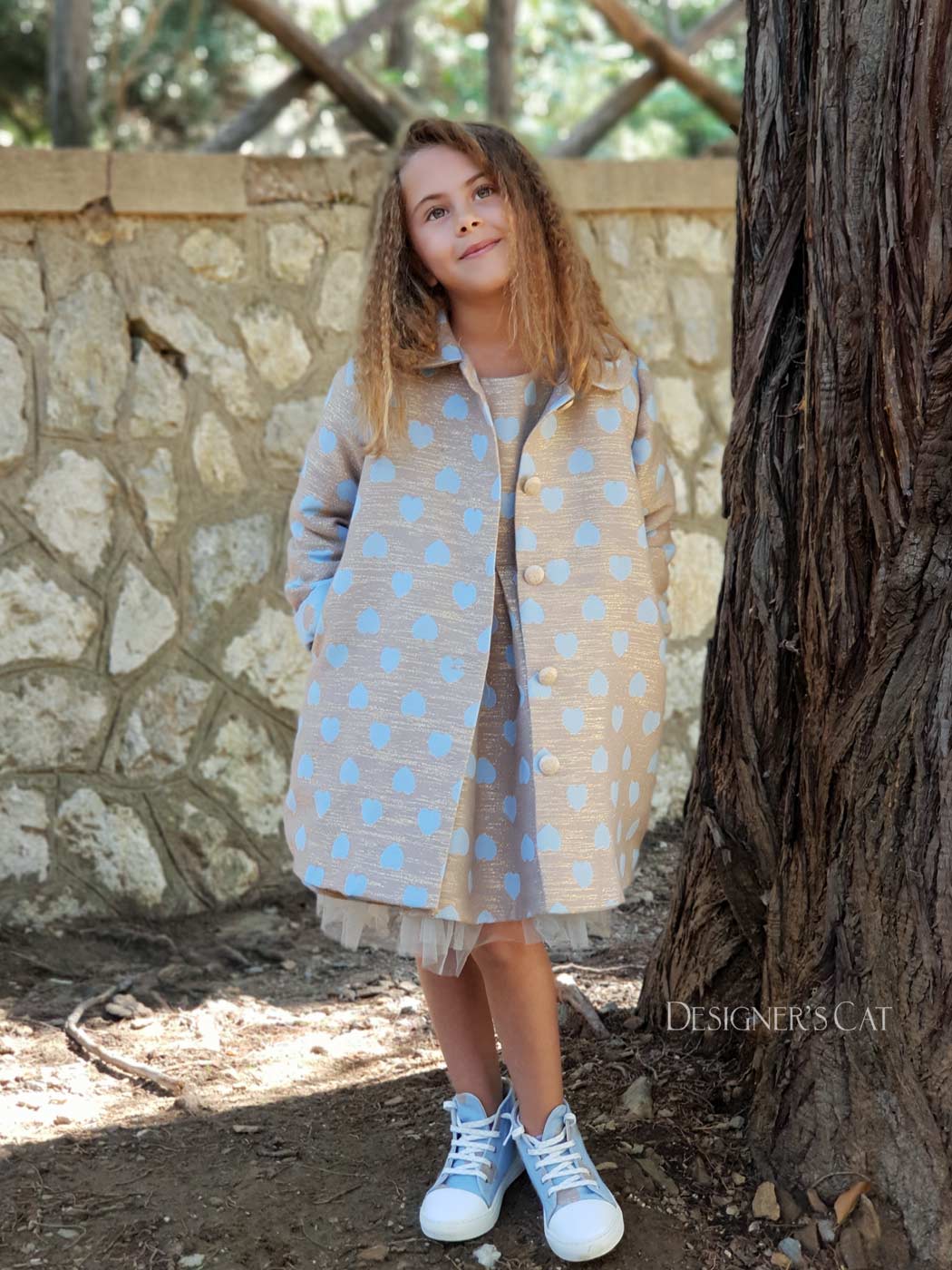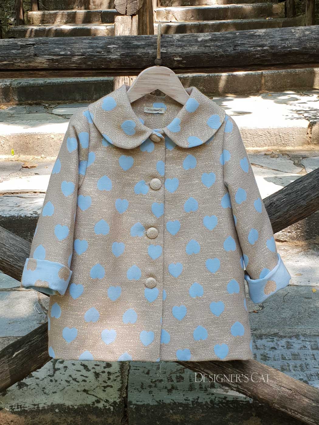 Εντυπωσιακό παλτό από εξαιρετικό σύμμεικτο βαμβακερό ύφασμα υφασμένο με νήματα LUREX. Είναι διακοσμημένο με υπέροχα vintage κουμπιά σε αποχρώσεις sweet cream και με όμορφο επαναλαμβανόμενο μοτίβο Jacquard με θέμα την Καρδιά. Υπέροχο παλτό, για όλες τις ώρες της ημέρας. Μπορεί επίσης να συνδυαστεί τέλεια με φόρεμα και παπούτσια από τη συλλογή "Designer's Cat Shoes". Διατίθεται σε μεγέθη ηλικίας από 1 έως 8 ετών.
