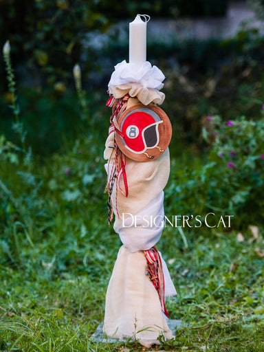Λαμπάδα διακοσμημένη με ξύλινο κοπτικό από φυσικό ξύλο σημύδα,ζωγραφισμένο εξ'ολοκλήρου στο χέρι (θέμα VESPA), διακοσμημένη με τρέσες και υλικά από...