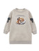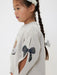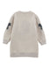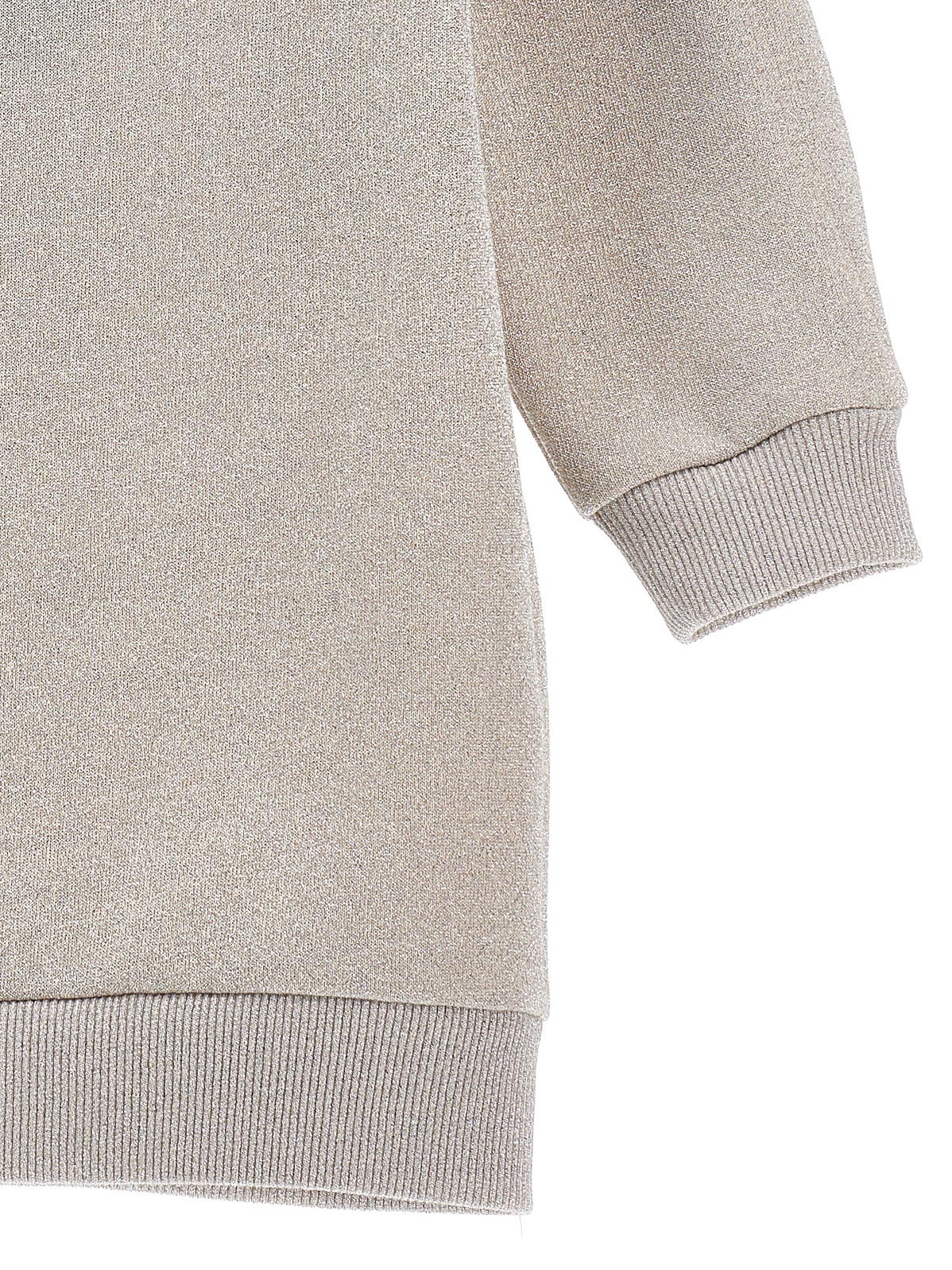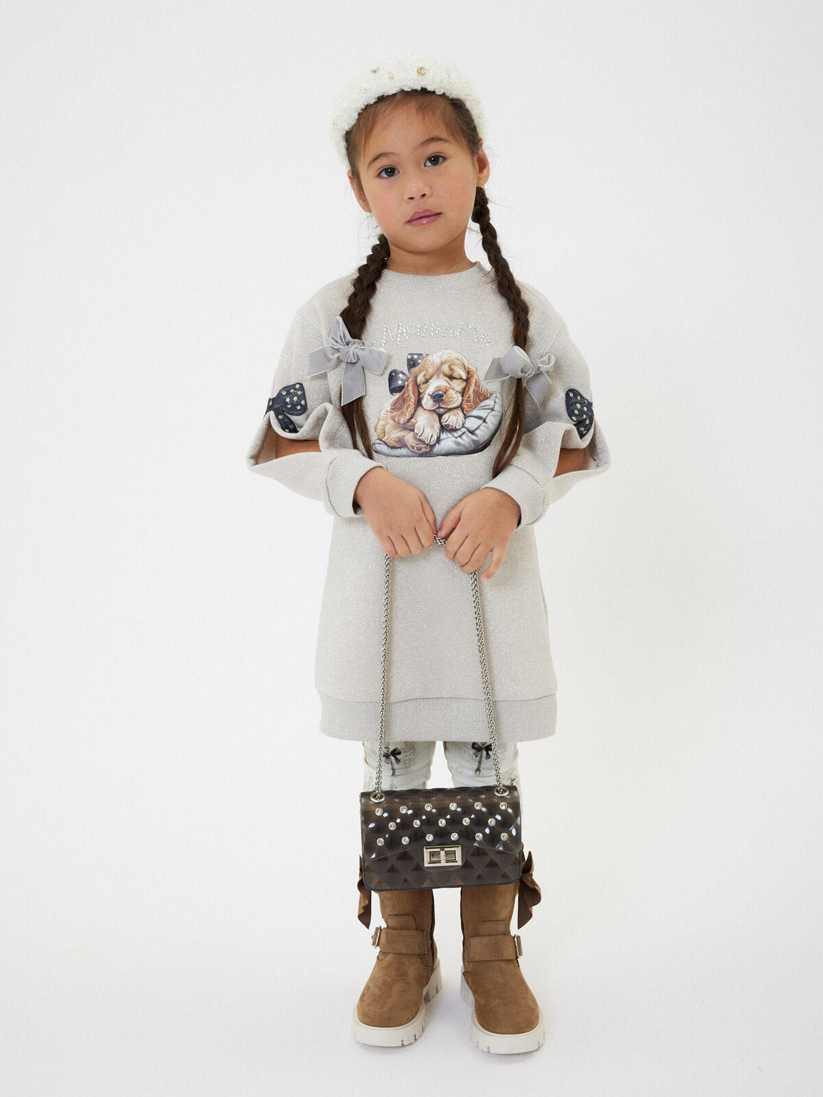 Πρακτικό και άνετο κοριτσίστικο φούτερ-φόρεμα με φιόγκους, σκισίματα στα μανίκια με κεντητούς φιόγκους. Σχήμα αυγού, στρογγυλή λαιμόκοψη με ραβδώσεις και φλις lurex με στάμπα στο μπροστινό μέρος.