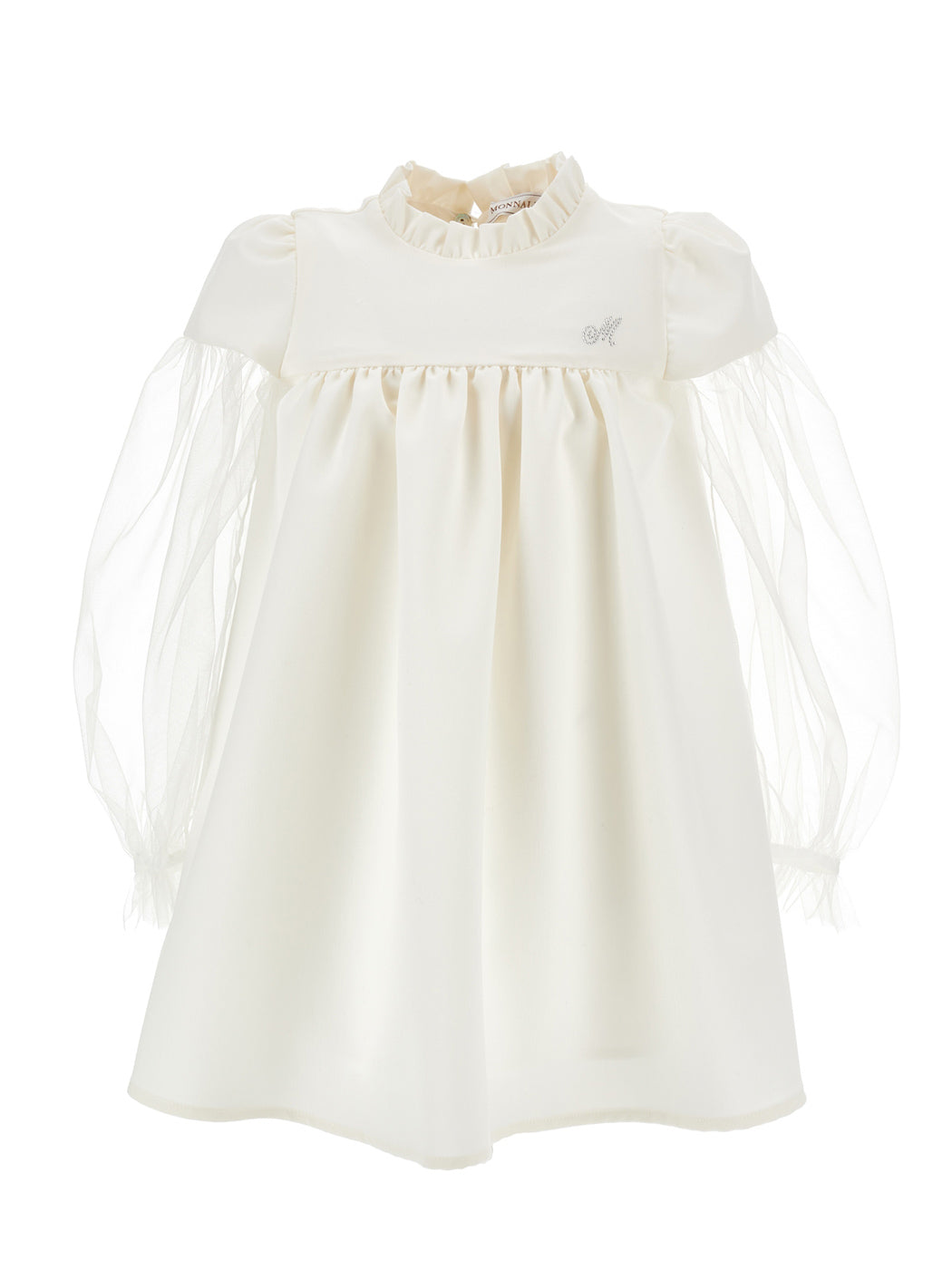 Κομψό φόρεμα μεψηλό λαιμό και διάφανα μανίκια σε τούλι, από την ιταλική μάρκα Monnalisa. Το μπούστο έχει υπέροχα στρας στο σχήμα του λογότυπου «M» της μάρκας. Μοντέρνα μανίκια από τούλι, με ελαστικές μανσέτες σε κομψό φουσκωτό σχήμα. Η φούστα είναι ενδεδυμένη με απαλό βαμβάκι για άνεση.