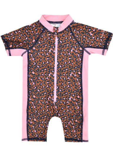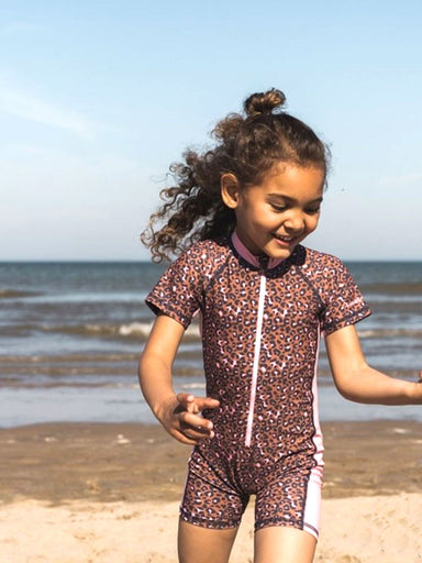 Ολόσωμο μαγιό για κορίτσι Ολόσωμο μαγιό για κοριτσάκι με animal τύπωμα . Το outfit έχει κοντά μανίκια και κοντό παντελόνι. Ανοίγει στο μπροστινό μέ...