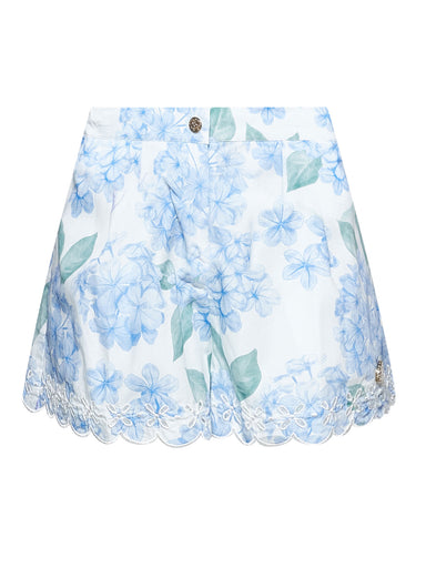 ΕΝΔΥΣΗ ΓΙΑ ΚΟΡΙΤΣΙΑRoberto Cavalli Junior - Βαμβακερό σορτς για κορίτσια σε γαλάζιο χρώμα, με φλοράλ τύπωμα, κυματιστό στρίφωμα, κούμπωμα με κουμπ...