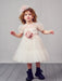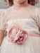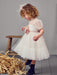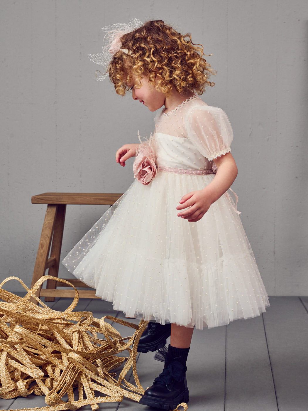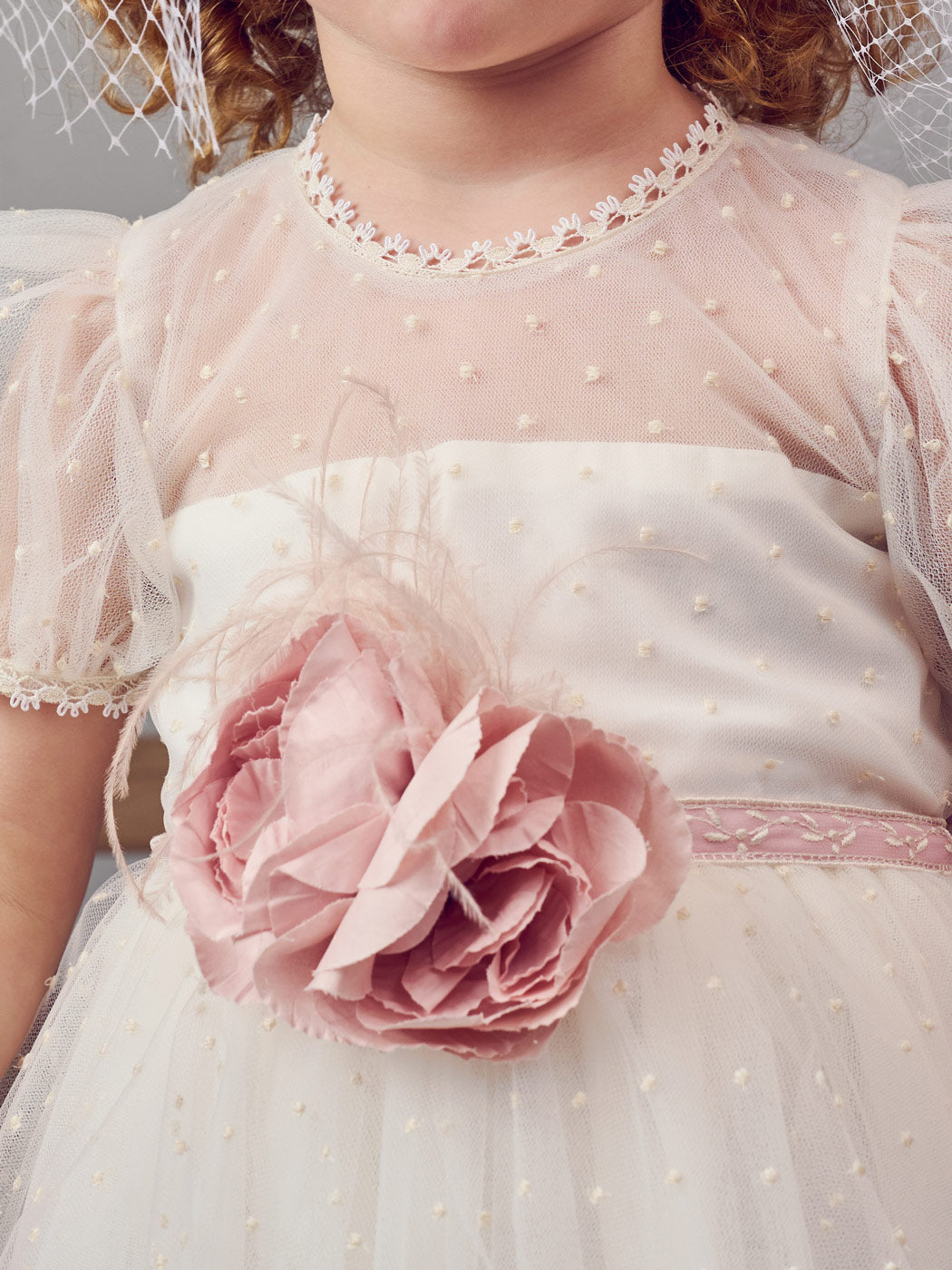 Ρομαντικό φόρεμα με φουσκωτά μανίκια και στρογγυλή λαιμό κόψη, από εξαιρετικό πουα τούλι,διακοσμημένο με όμορφα διακοσμητικά. Το outfit ολοκληρώνεται με vintage χειροποίητα λουλούδια στο μπροστινό μέρος. Η εσωτερική επένδυση είναι 100% απαλό βαμβάκι. Ένα υπέροχο φόρεμα για μοναδικές στιγμές όπως η βάπτιση. Μπορεί να συνδυαστεί με ασορτί αξεσουάρ μαλλιών