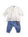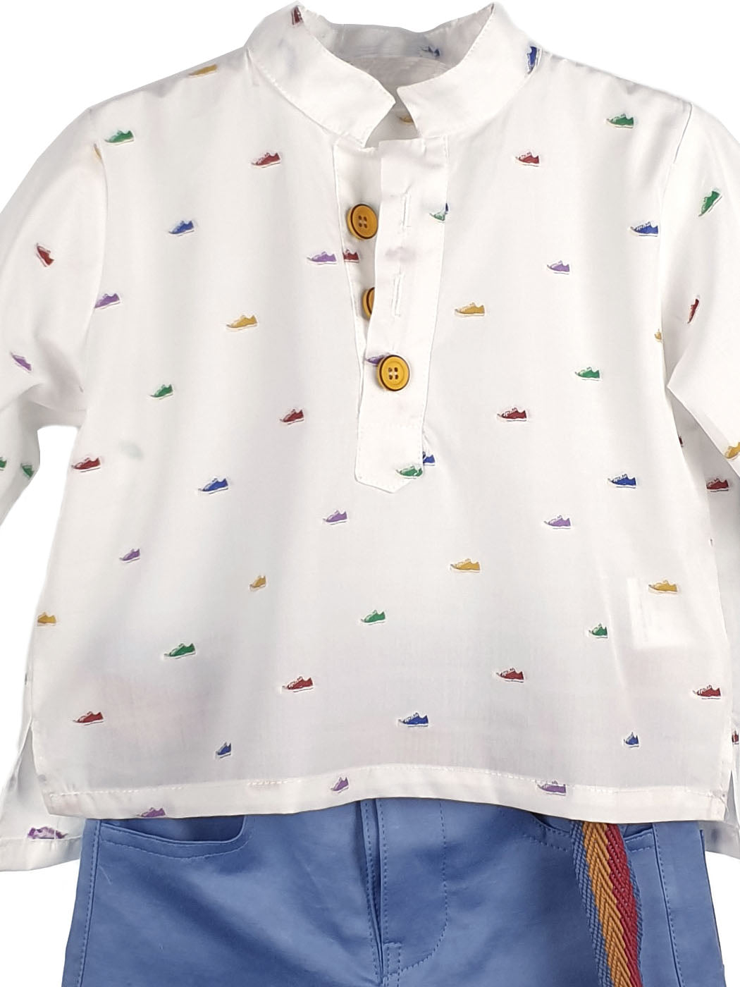 Ιταλική φινέτσα σε ένα υπέροχο σύνολο "DESIGNER'S CAT", με ιδιαίτερες λεπτομέρειες, όπως τα κεντημένα μοτίβα στο πουκάμισο με γιακά Μάο. Τό παντελόνι σε απόχρωση του Light blue συνδυάζεται άψογα με την μοντέρνα γκρο ζώνη. Το σετ αποτελείται από 3 τεμ. (παντελόνι, πουκάμισο και ζώνη). Ένα κομψό σύνολο για τους μικρούς πρωταγωνιστές. Μπορεί να συνδυαστεί άψογα με παπούτσια της συλλογής "Designer’s Cat shoes".