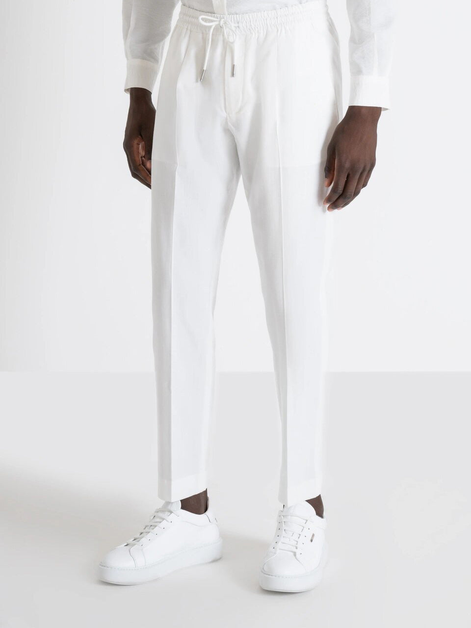 Classic trousers carrot fit in in twill cotton. Designed with a comfortable fit, this model is characterized by an elastic waistband with drawstring and a central crease with an artisanal flair. The garment is completed by slant pockets on the sides and welt pockets with a button on the back.