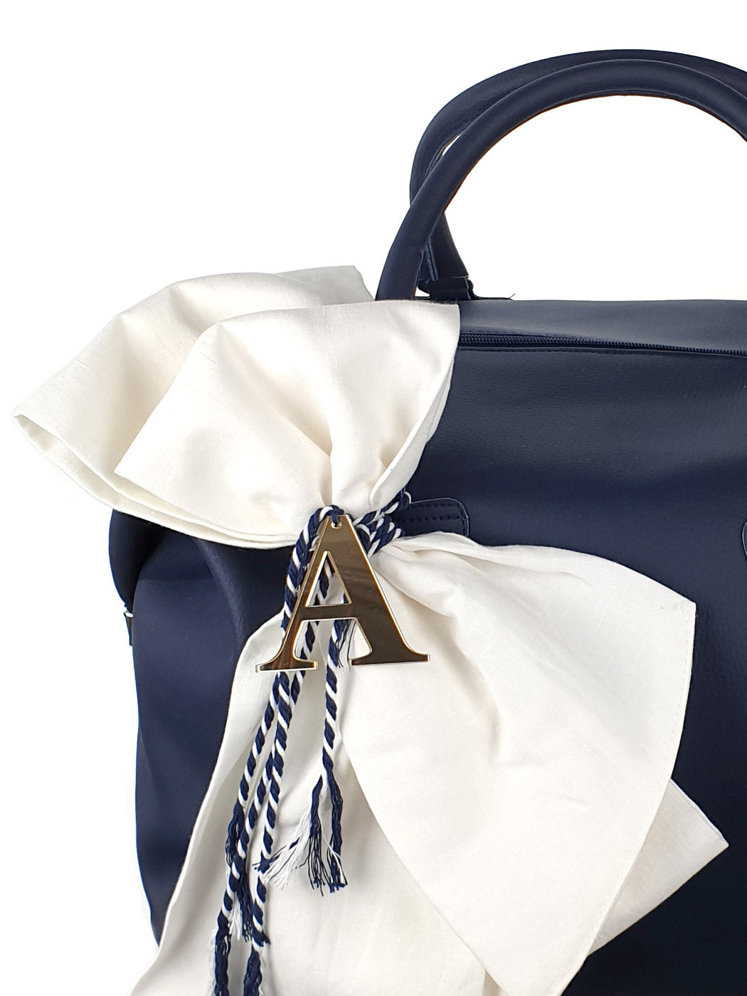 Μια κομψή χειροποίητη τσάντα βάπτισης, με εμφάνιση δέρμα και διπλή λαβή. Μπορεί να χρησιμοποιηθεί και ως χειραποσκευή αφαιρώντας το διακοσμητικό αξεσουάρ. Άνετο και πρακτικό για μεταφορά και αποθήκευση όλων των βαπτιστικών.