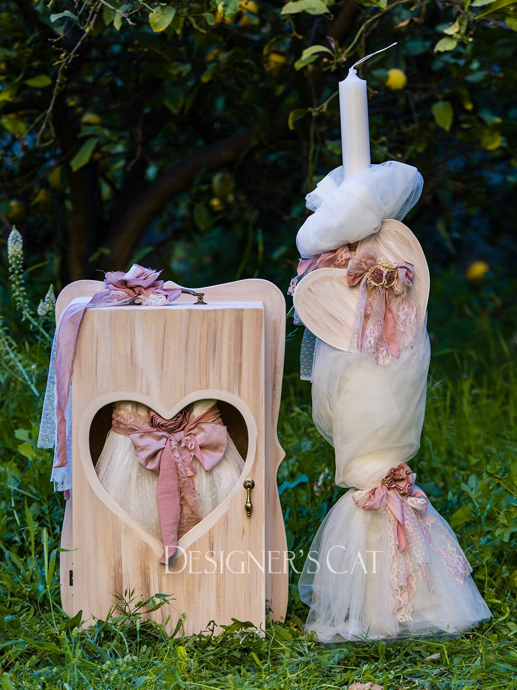 Λαμπάδα δεμένη με ύφασμα και δαντέλα. Διακοσμημένη με κοπτικό αξεσουάρ από φυσικό ξύλο σημύδα (θέμα καρδιά), συνδυασμένο με χειροποίητα ασορτί αξεσουάρ. Συνδυάζεται με φορέματα της συλλογής DESIGNER'S CAT, καθώς και μια πλήρη σειρά ειδών βάπτισης.