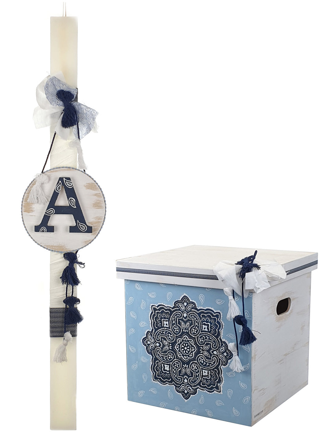 Λαμπάδα βάπτισης ορθογώνια με Μονόγραμμα φτιαγμένη εξολοκλήρου στο χέρι, διακοσμημένη με υφάσματα από το ασορτί outfit για αγόρια της συλλογής Designer's Cat. Συνδυάζεται με αξεσουάρ βάπτισης.