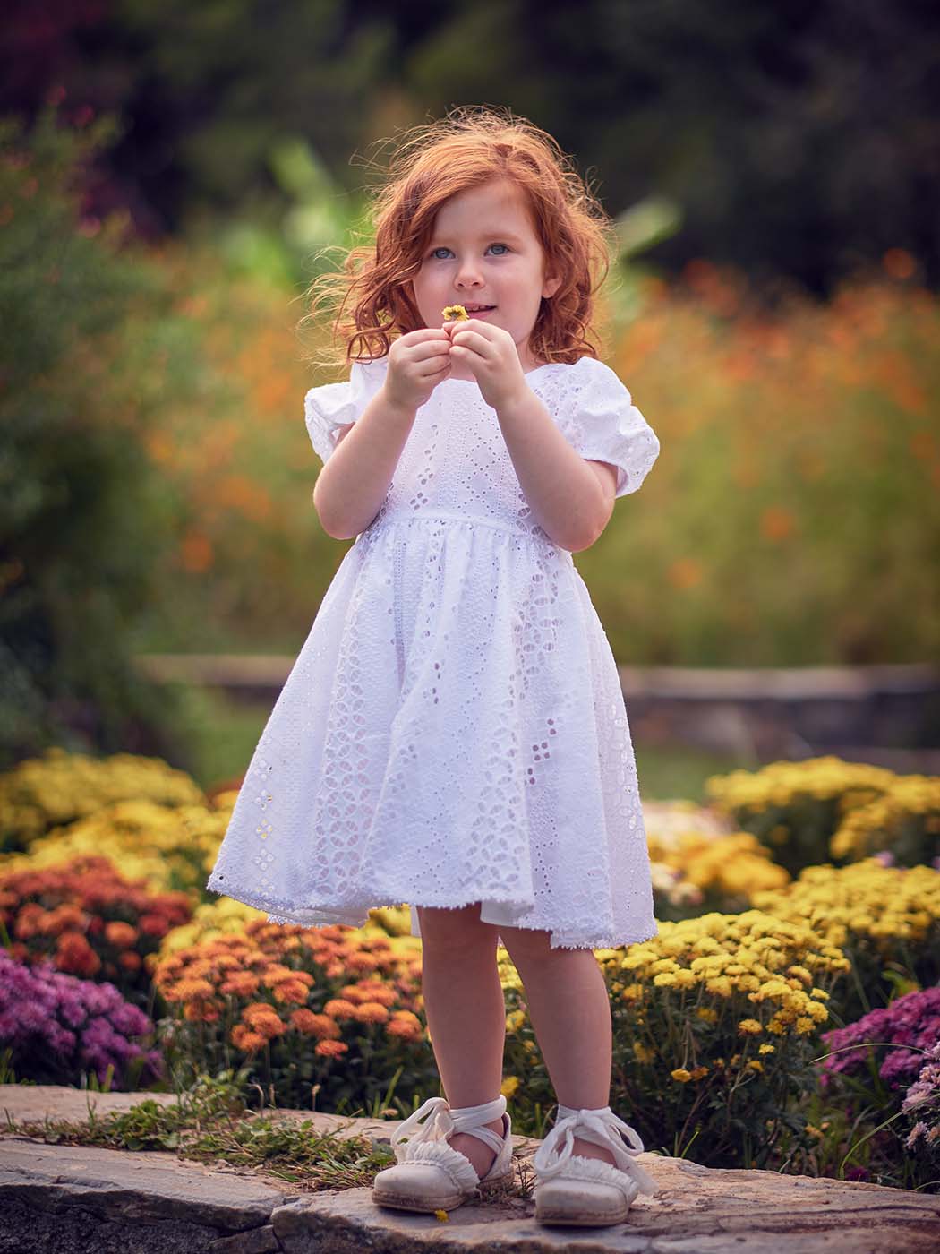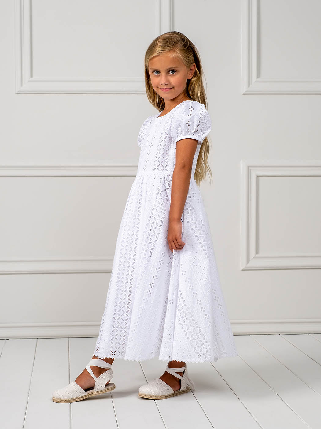 Χαριτωμένο φόρεμα σε στυλ Boho, από εξαιρετικό κεντητό βαμβακερό ύφασμα. Το φόρεμα είναι διακοσμημένο με βολάν στα μανίκια. Η εσωτερική επένδυση είναι 100% βαμβάκι. Το φόρεμα Gianna μπορεί να συνδυαστεί με αντίστοιχη κορδέλα για τα μαλλιά και παπούτσια από την συλλογή "Designer's Cat Shoes".Διαθέσιμα μεγέθη: από 1 έως 12 ετών. Χρώμα: Λευκό