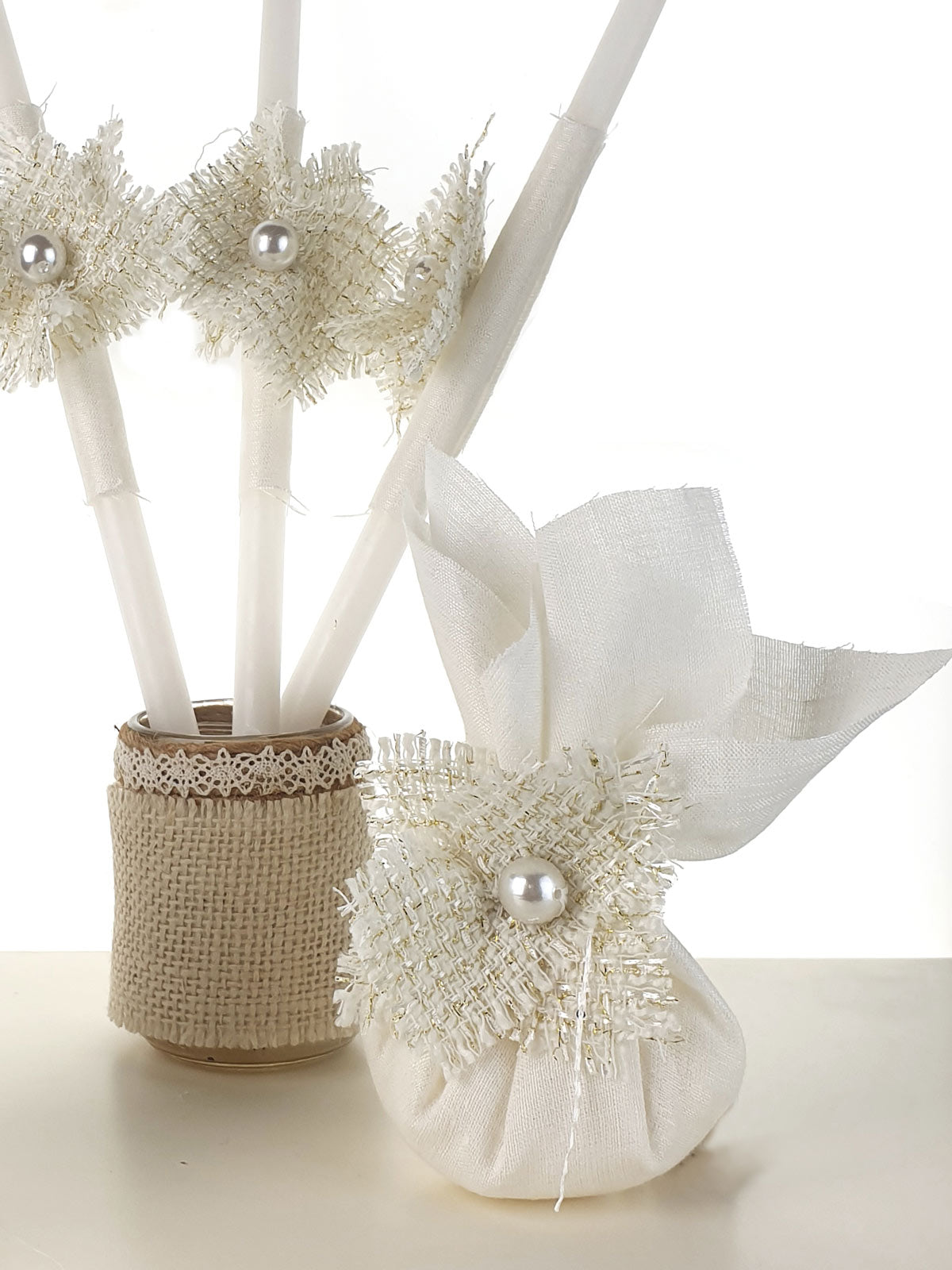 Λαδοσέτ βάπτισης 5 τεμ - 1 μπουκάλι για το λάδι, 3 κεριά & αρωματικό σαπούνι. Διακοσμημένο με απλικέ φιόγκους από ύφασμα twill και πέρλες. Συνδυάζεται ασορτί με το βαπτιστικό φόρεμα από τη συλλογή Designer's Cat.