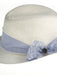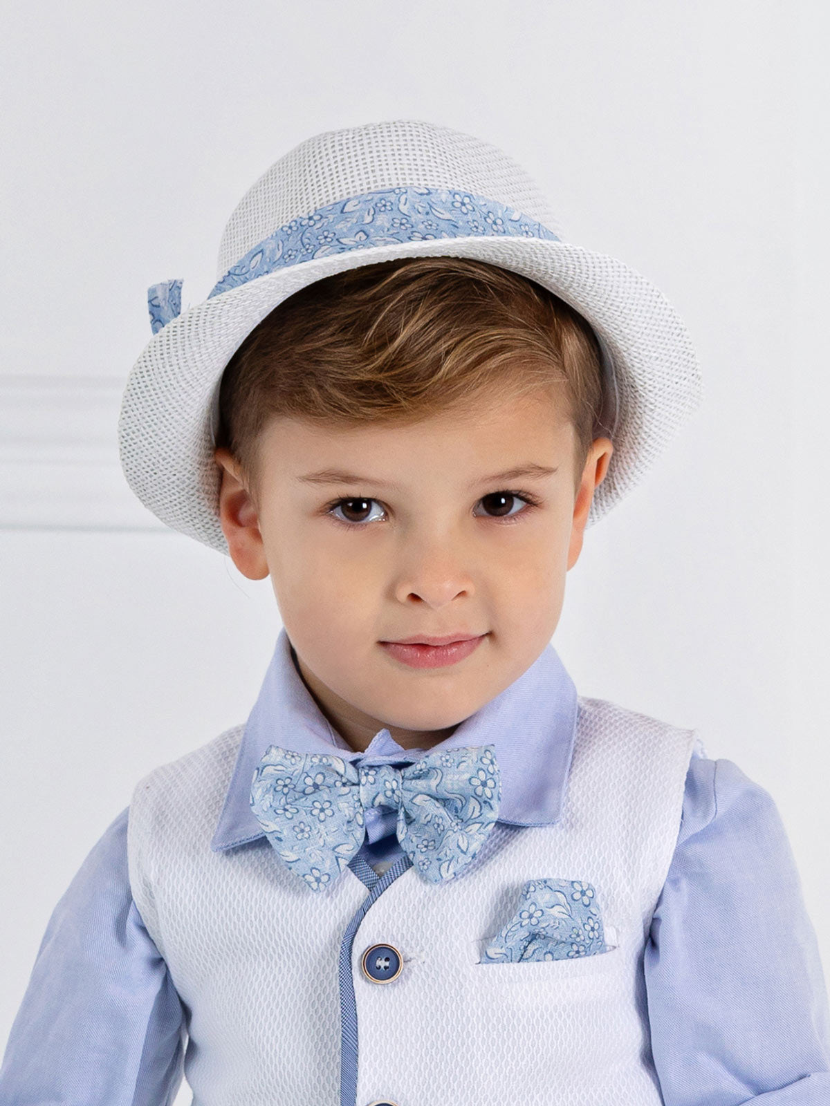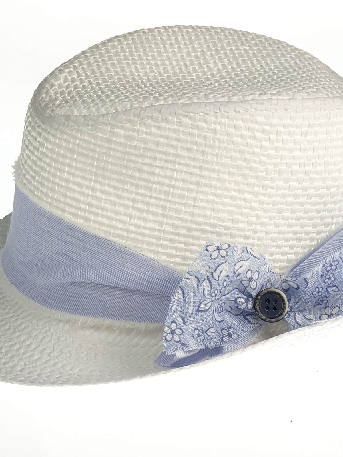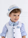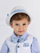 Κομψό καπέλο για αγόρι, με κανονικό γείσο διακοσμημένο με φλοράλ γαλάζιο φιόγκο. Ένα όμορφο καπέλο για ειδικές περιστάσεις όπως η βάπτιση.