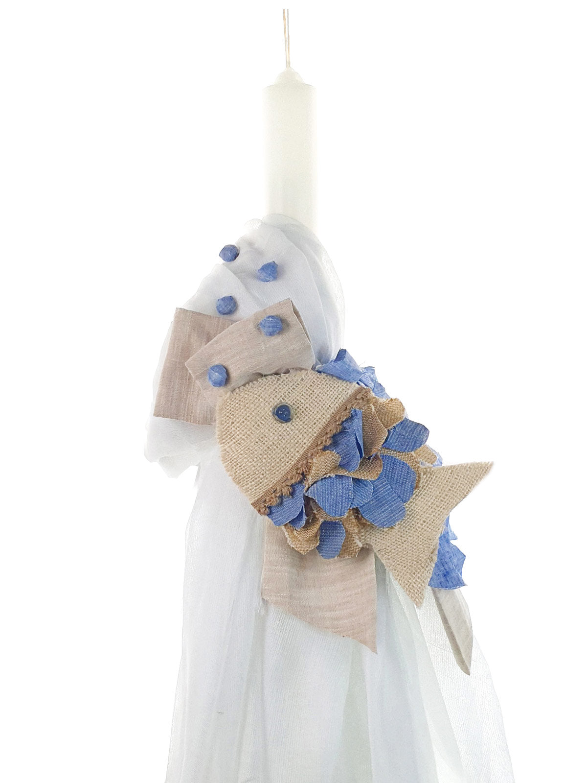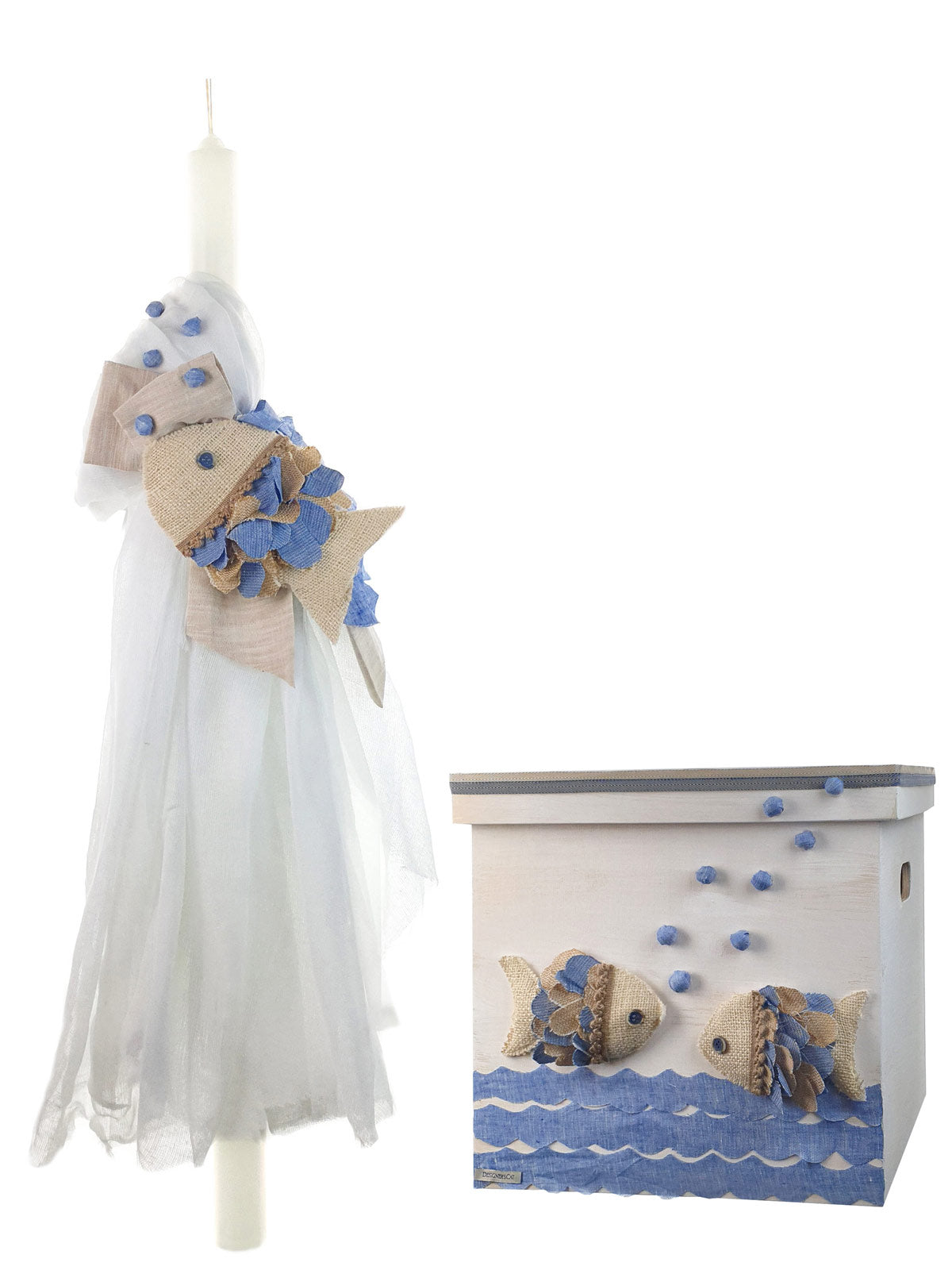 Λαμπάδα βάπτισης Designer's Cat για αγόρι, διακοσμημένη με υφασμάτινο χειροποίητο θέμα (θάλασσα-Ψαράκια), διακοσμημένη με υφάσματα και υλικά από το αντίστοιχο σύνολο της συλλογής. Συνδυάζεται με όλα τα αξεσουάρ βάπτισης.