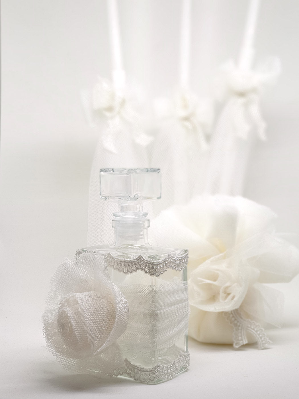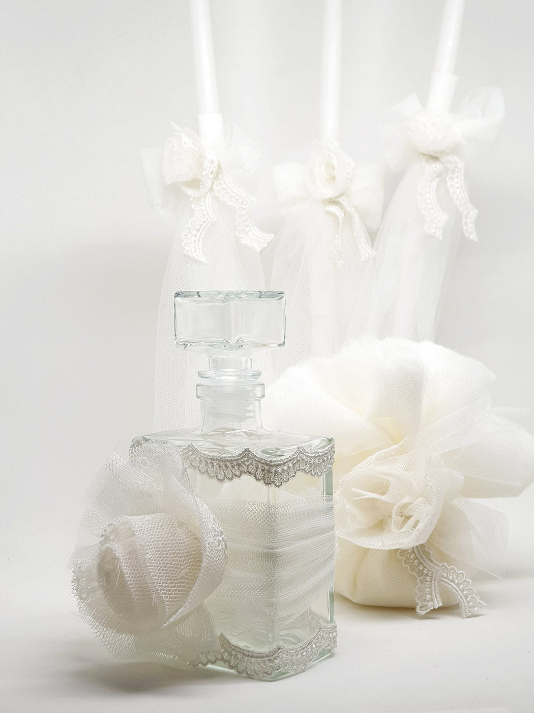 Λαδοσέτ βάπτισης 5 τεμ. (1 μπουκάλι για το λάδι, 3 κεριά & αρωματικό σαπούνι).Διακοσμημένο με τούλι,δαντέλα και υπέροχα χειροποίητα λουλούδια σε sweet cream απόχρωση.Συνδυάζεται άψογα με τα φόρεματα βάπτισης της συλλογής Designer's Cat.