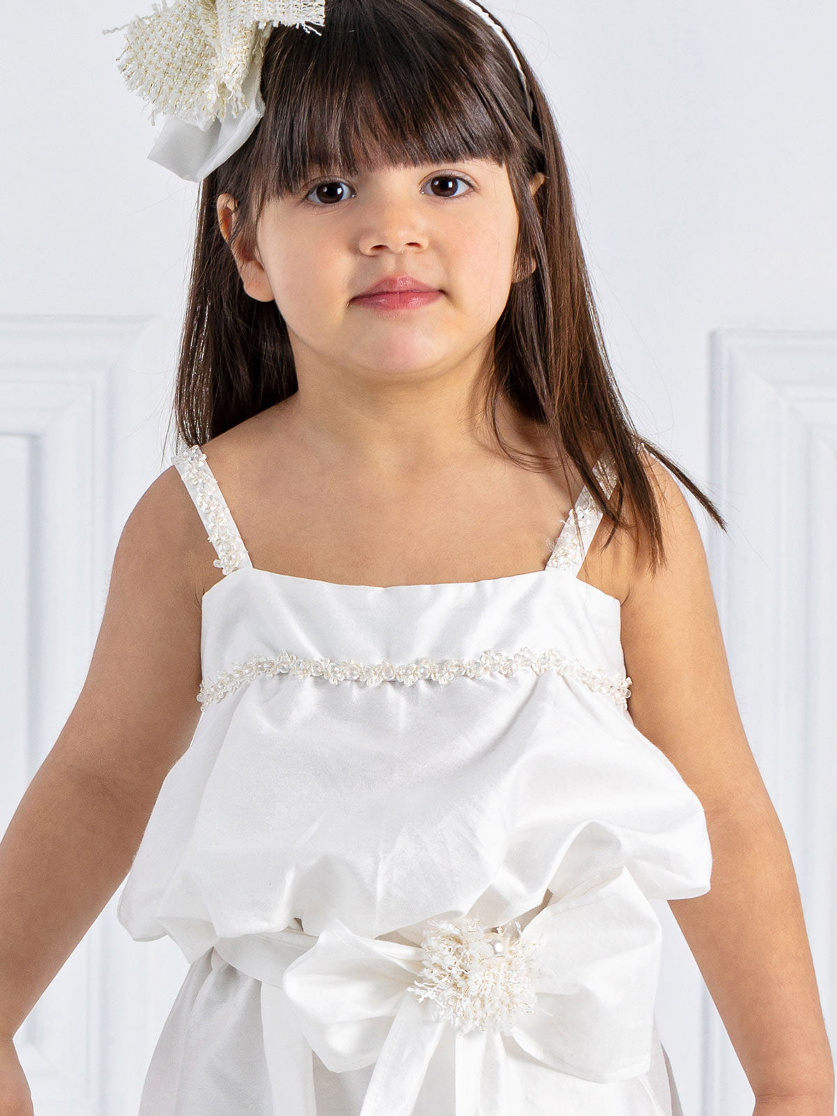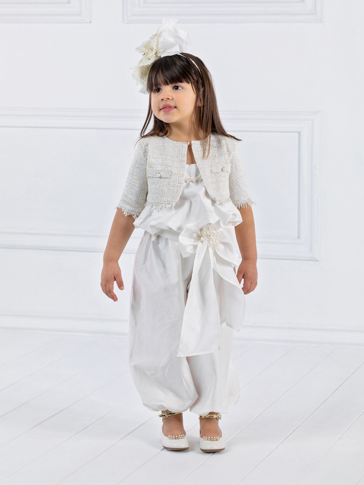 Σαλβάρι βάπτισηςσε Boho γραμμή , από βαμβάκι και μετάξι, με εντυπωσιακό maxi φιόγκο που δένει στο μπούστο. Ένα καλοκαιρινό ρούχο που είναι ταυτόχρονα άνετο και κομψό. Μπορεί να συνδυαστεί με έξτρα ασορτί κορδέλα, με παπουτσάκια Εσπαντρίγια ή σανδάλια από τη συλλογή "Designer’s Cat shoes.