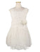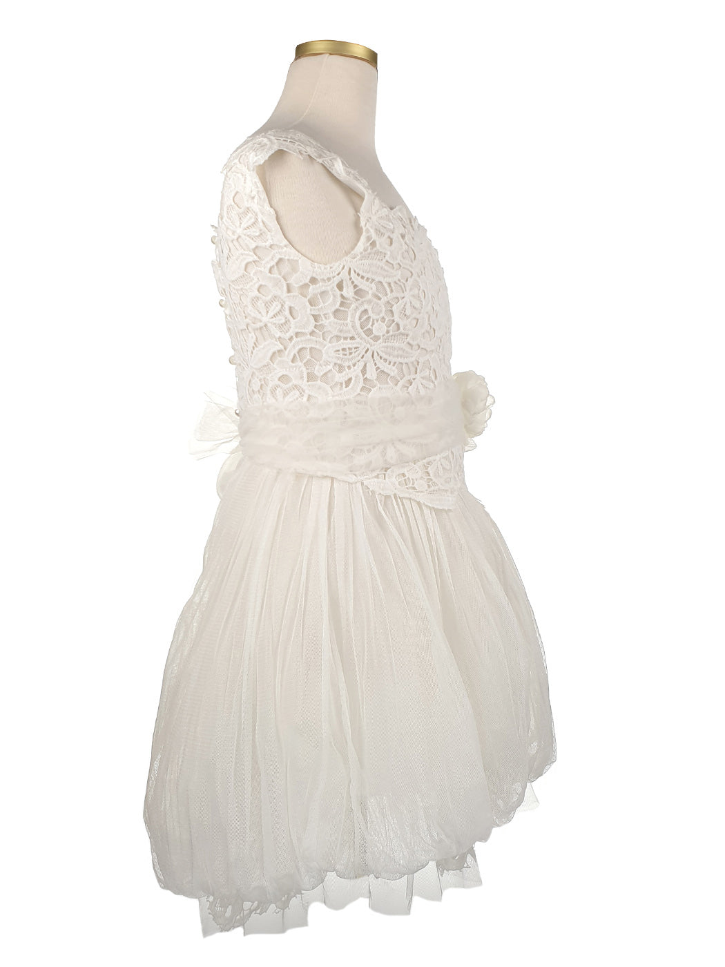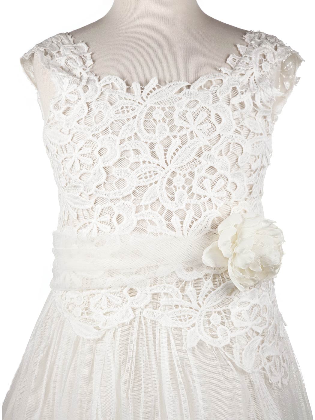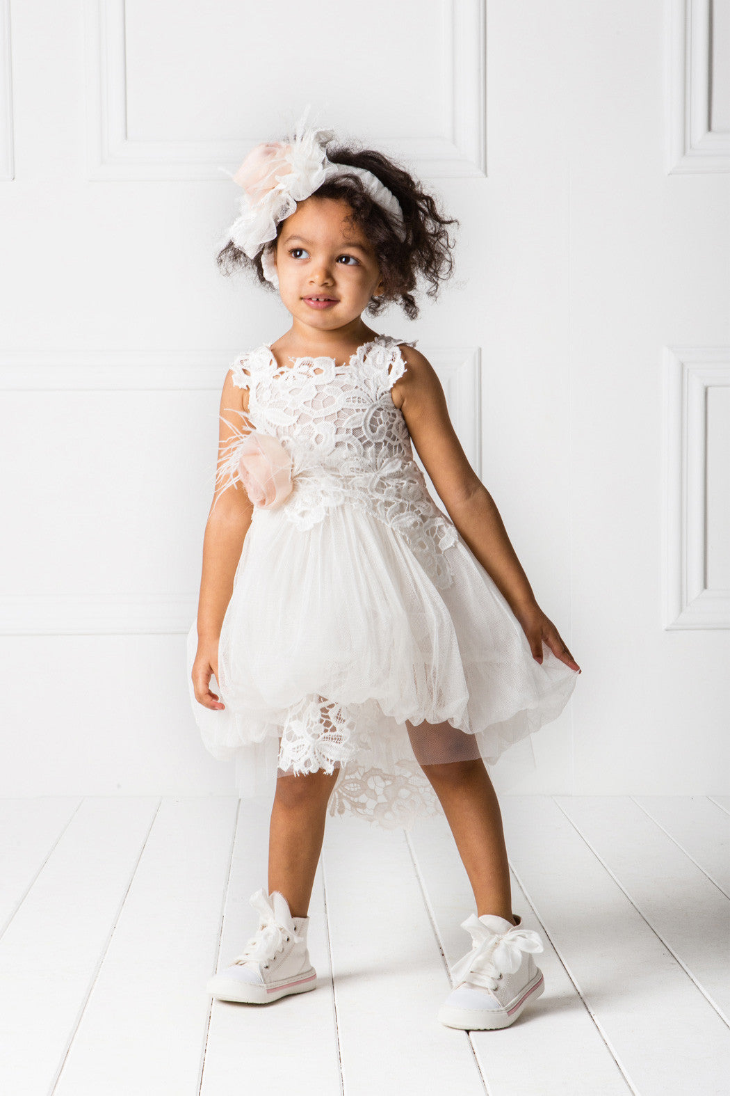 Ασύμμετρο φόρεμα μπαλούν με ουρά, υψηλής σχεδίασης. Αποτελείται από φίνο βαμβακερό τούλι, διακοσμημένο με γαλλική guipure δαντέλα στο μπούστο, τα μανίκια και την ουρά. Έχει συνδυαστεί με χειροποίητο λουλούδι σε χρώμα απαλό ροζ (vintage). Εσωτερικά είναι επενδυμένο με 100% βαμβακερό ύφασμα. Μπορεί να συνδυαστεί άψογα με αντίστοιχο μπολερό και παπούτσια της συλλογής "Designer’s Cat Shoes".