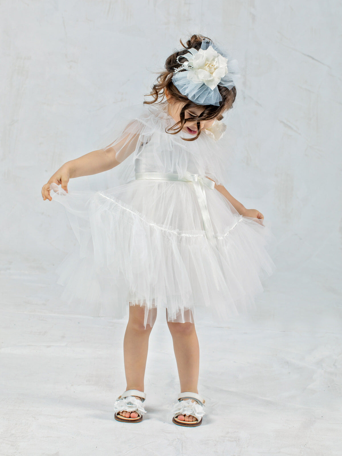 Designer's Cat - Ρομαντικό φόρεμα από τούλι, με βολάν στο στήθος, διακοσμημένο με σατέν ζώνη και χειροποίητο λουλούδι. Φούστα με βολάν και εσωτερική φόδρα 100% βαμβάκι. Ένα όμορφο σύνολο για ειδικές περιστάσεις.