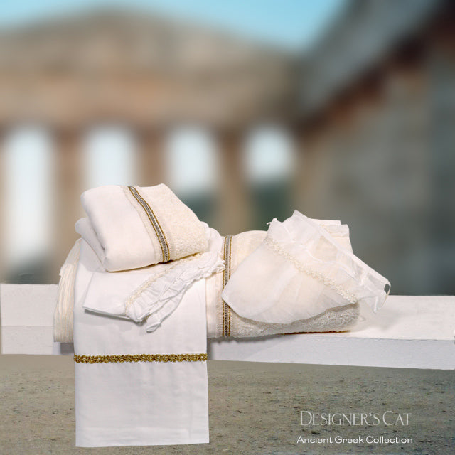 Αρχαιοελληνικό φόρεμα από εξαιρετικό μαλακό τούλι, διακοσμημένο με φίνα βαμβακερή τρέσα με χρυσές λεπτομέρειες. Εσωτερικά είναι επενδυμένο με 100% βαμβακερό ύφασμα. Ένα φόρεμα εξαιρετικής αισθητικής που προσδίδει απλότητα και αίσθηση ελευθερίας ταυτόχρονα. Συνδυάζεται άψογα με χρυσό πέδιλο της συλλογής "Designer’s Cat Shoes"