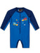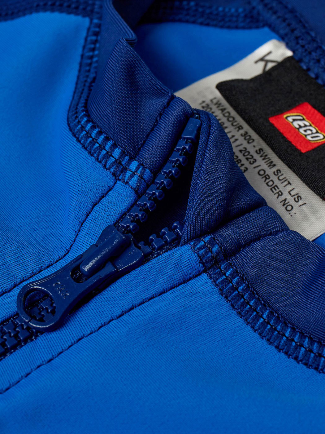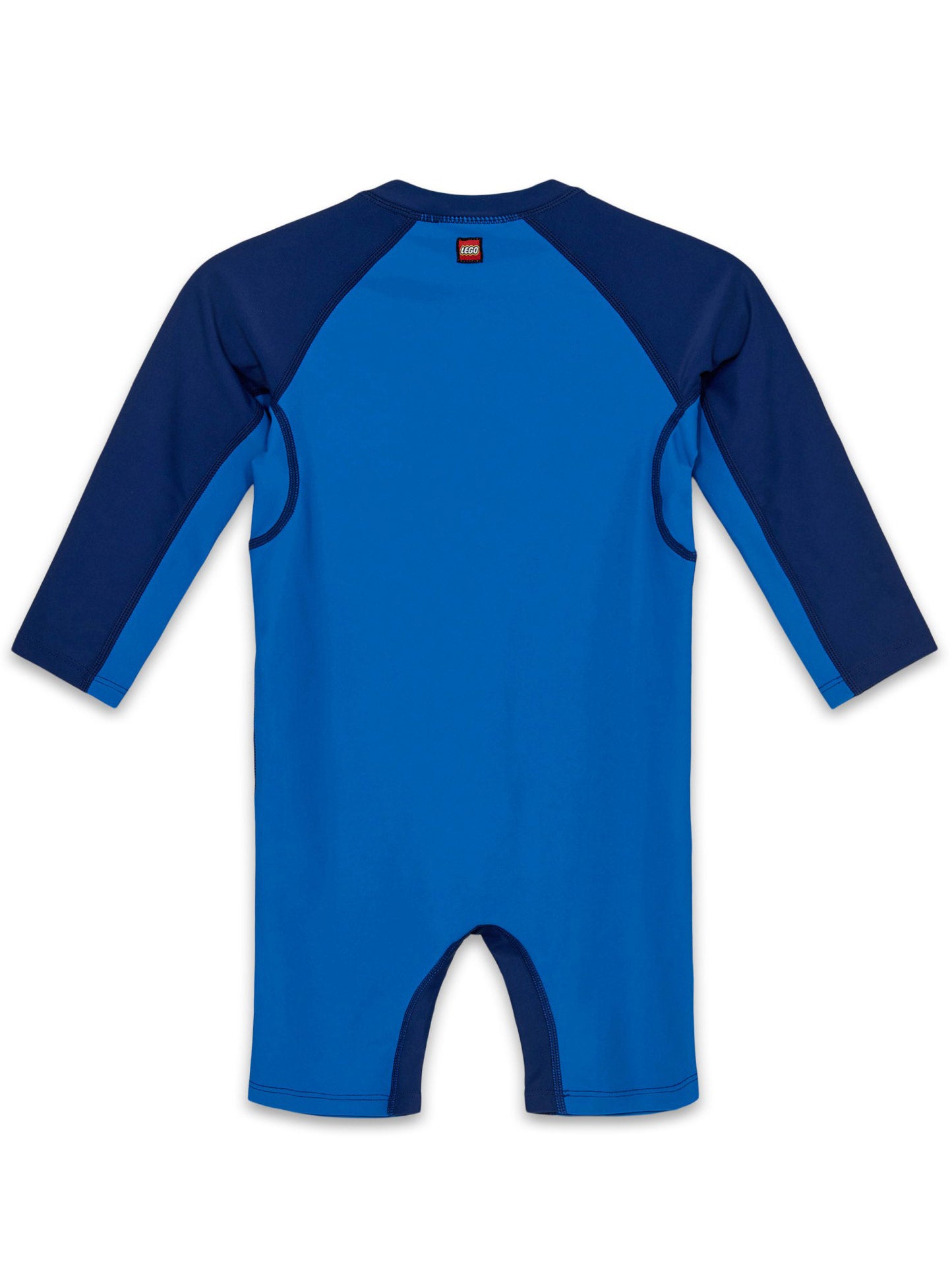 Μαγιό LEGO Duplo σε μπλε χρώμα, με στάμπα στο μπροστινό μέρος. Οι ώμοι, η πάνω πλευρά των μανικιών και ανάμεσα στα πόδια είναι σε πιο σκούρα απόχρωση. Το outfit έχει μακριά μανίκια και κοντό παντελόνι.Ανοίγει στο μπροστινό μέρος με φερμουάρ με προστατευτικό για το πηγούνι. Είναι κατασκευασμένο με ειδικό φίλτρο UV 40+, ώστε το παιδί να προστατεύεται καλά από τις βλαβερές ακτίνες του ήλιου.