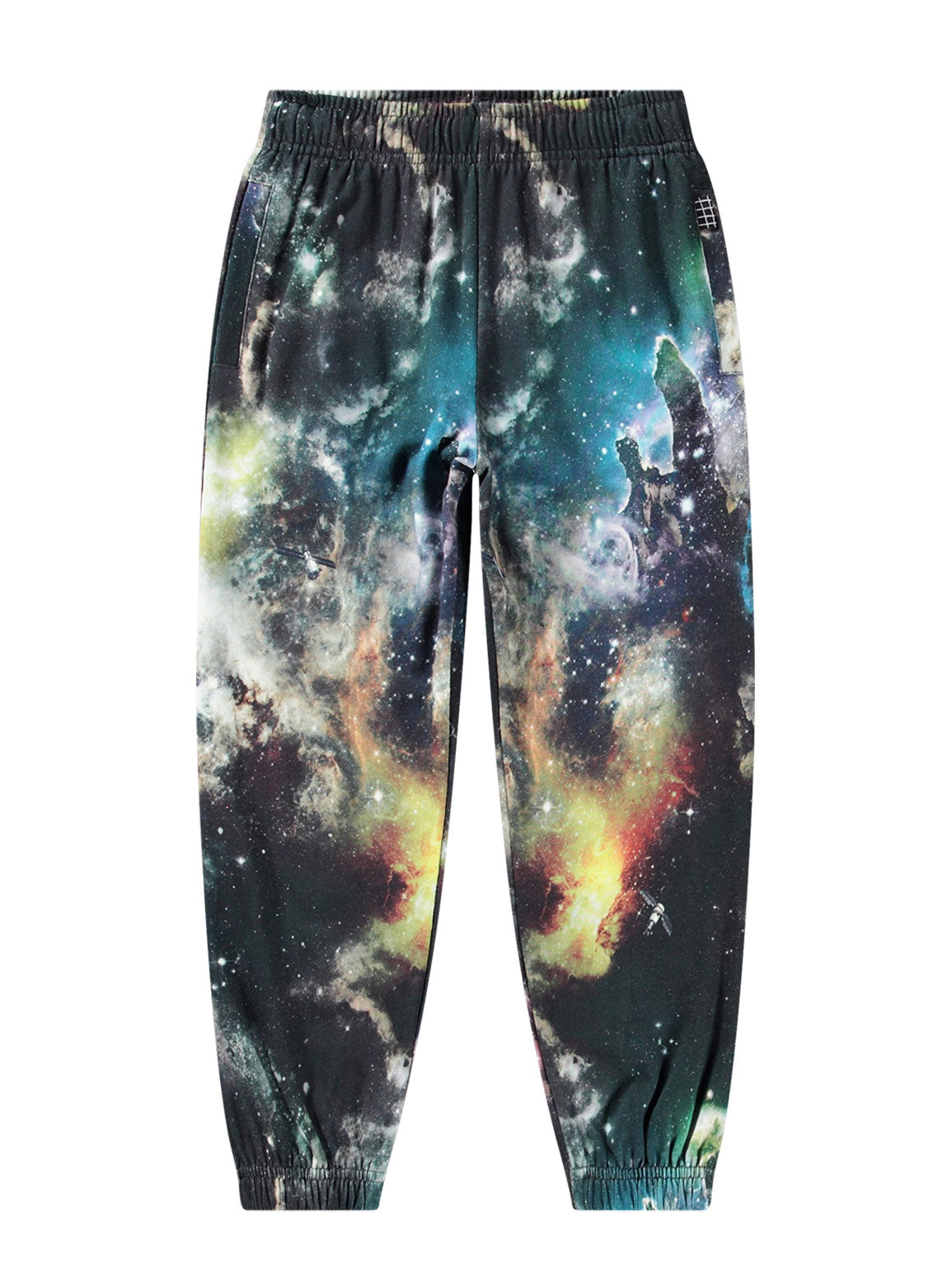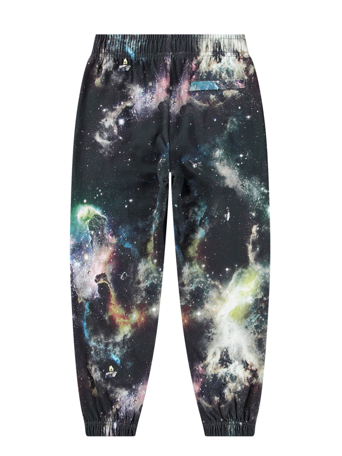 Sweatpants in organic cotton with an all-over print inspired by outer space. The trousers have a regular fit, an elastic waist with an internal drawstring, elastic ankles, and side pockets. They have a brushed inner face, making them soft and warm to wear. The print includes freely floating satellites, which can be seen upon closer inspection.
