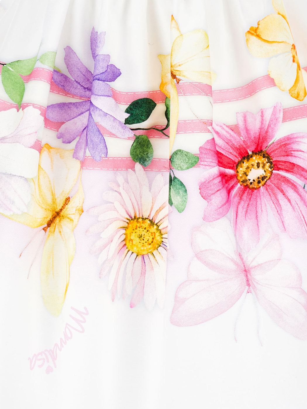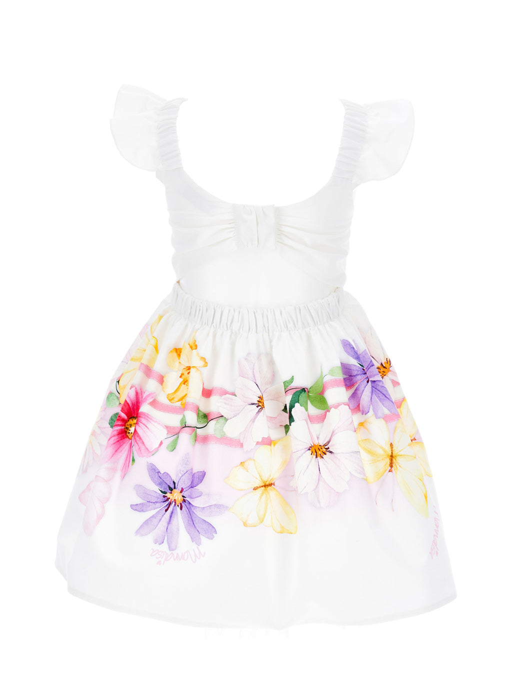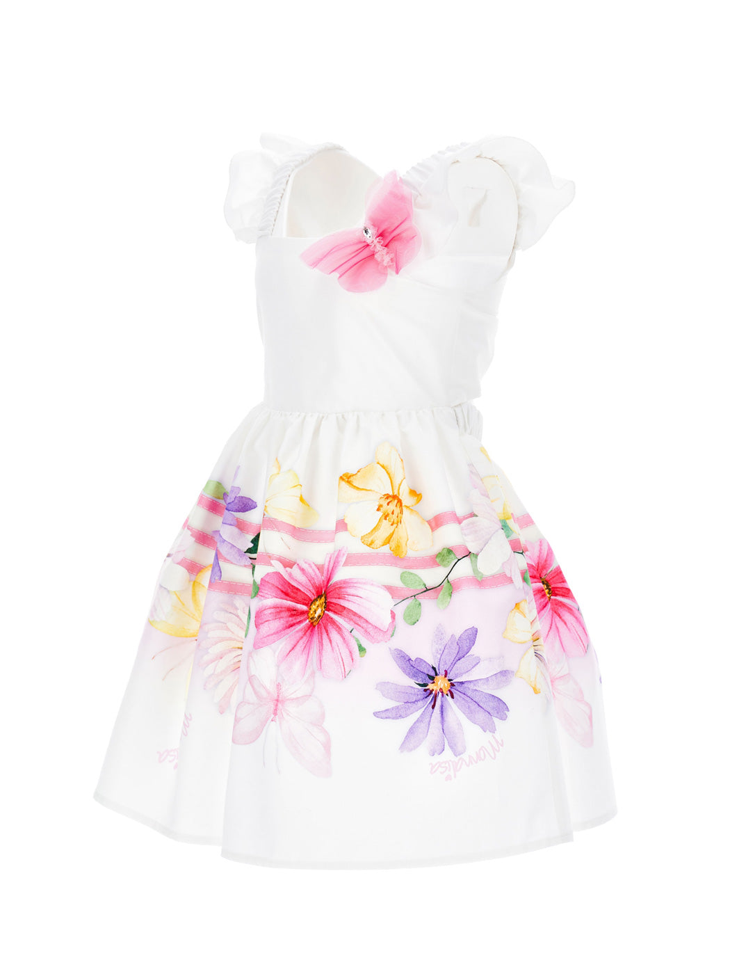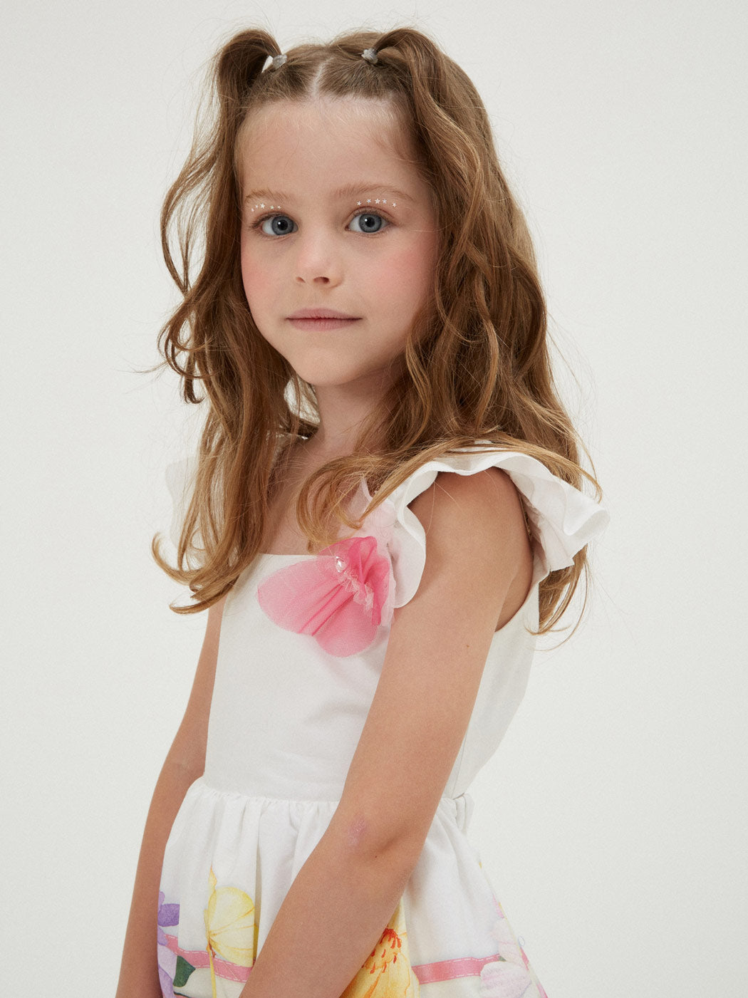 Κομψό Floral φόρεμα από βαμβακερή ποπλίνα με τετράγωνη λαιμό-κόψη, βολάν μανίκι και τούλινη πεταλούδα διακοσμημένη με στρας.