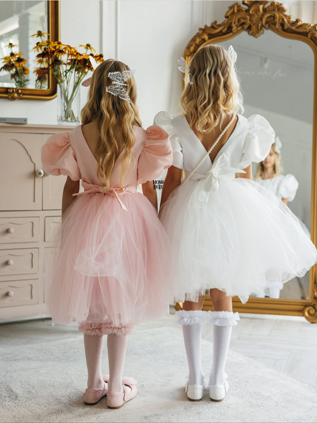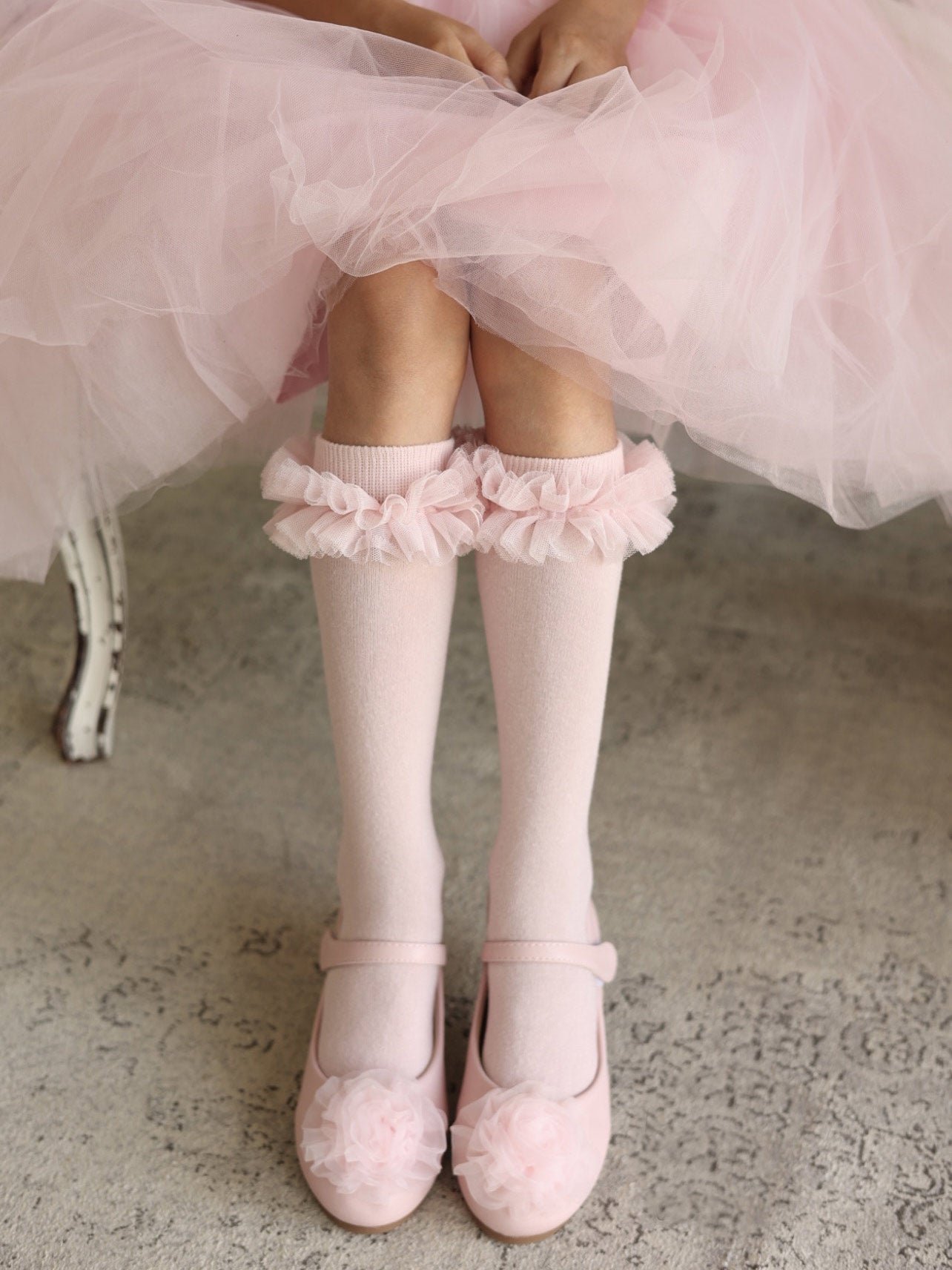 Amazing girl's smooth knee-high socks, with a tulle ruffle sewn by hand, in six matching colors by TiuLove Collection.