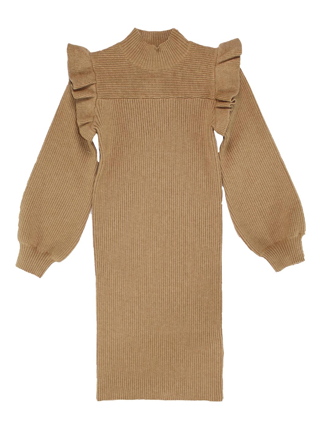 Πλεκτό φόρεμα με βολάν στους ώμους σε καμηλό χρώμα