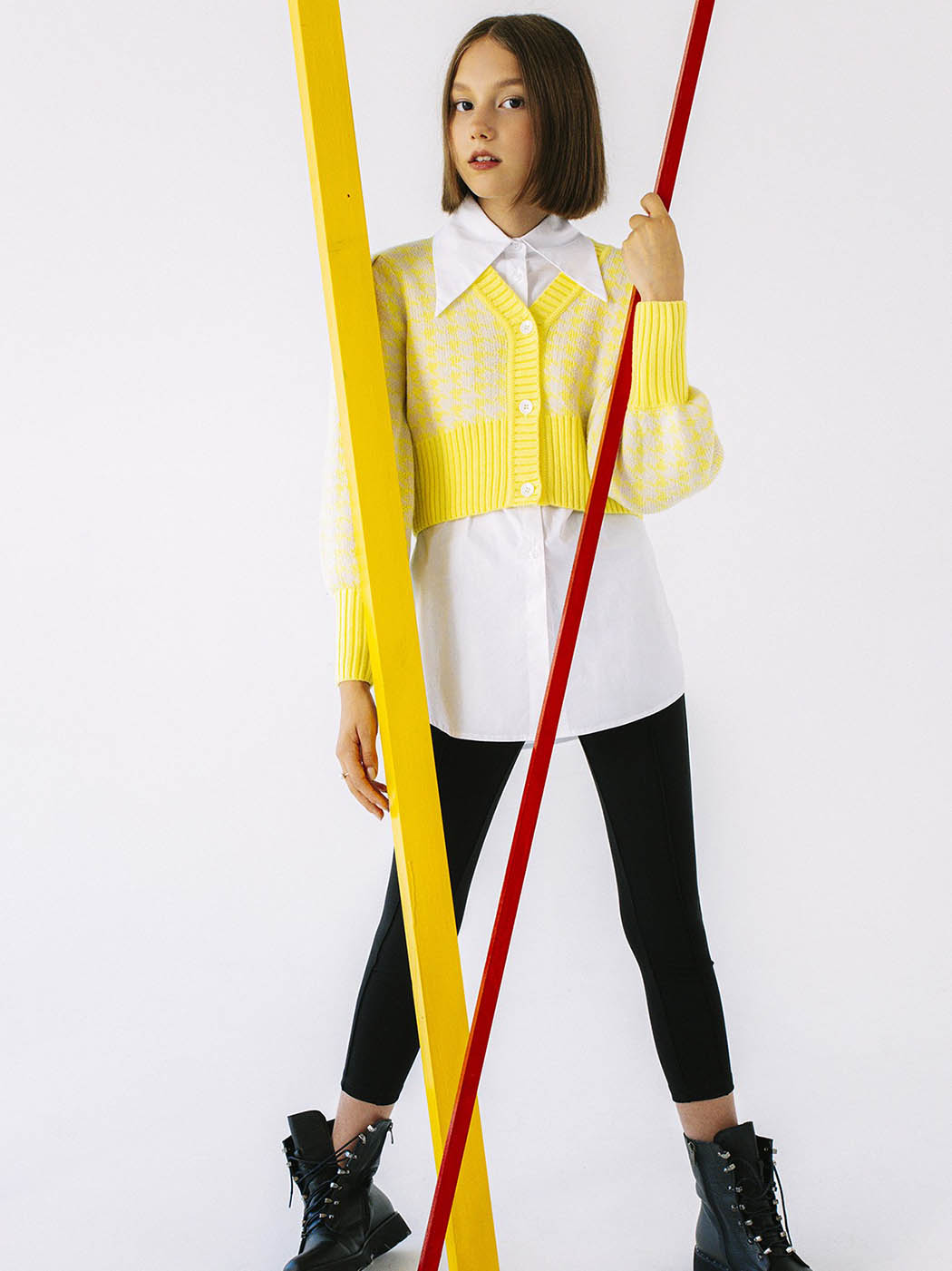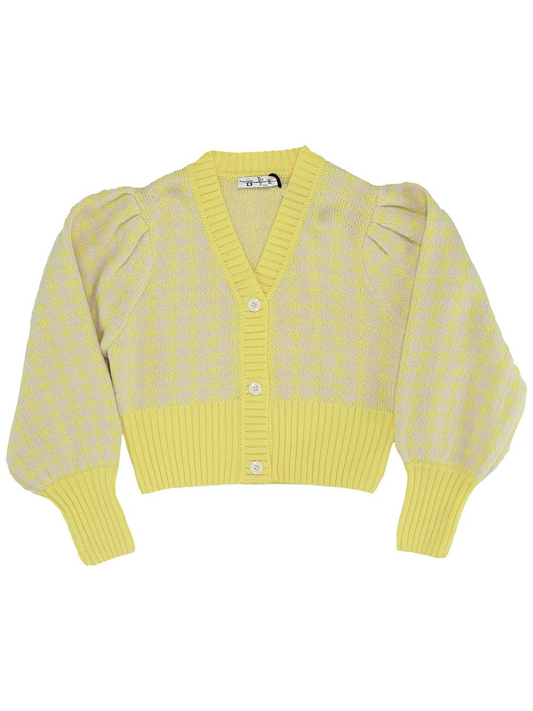 Κομψή πλεκτή ζακέτα pied de poule για κορίτσια, σε γλυκό κίτρινο χρώμα.