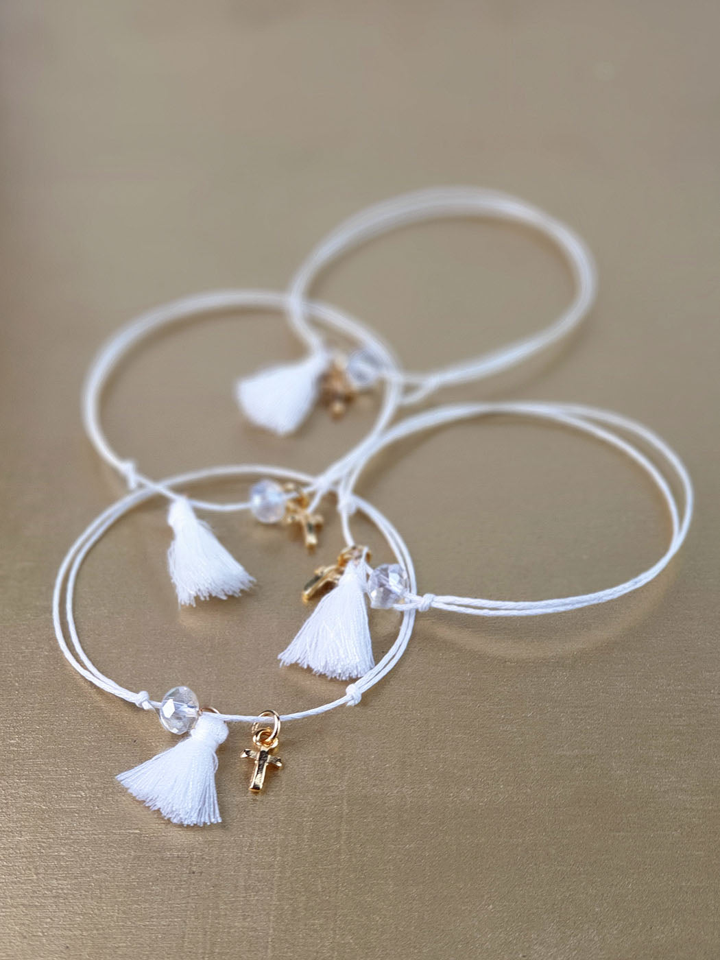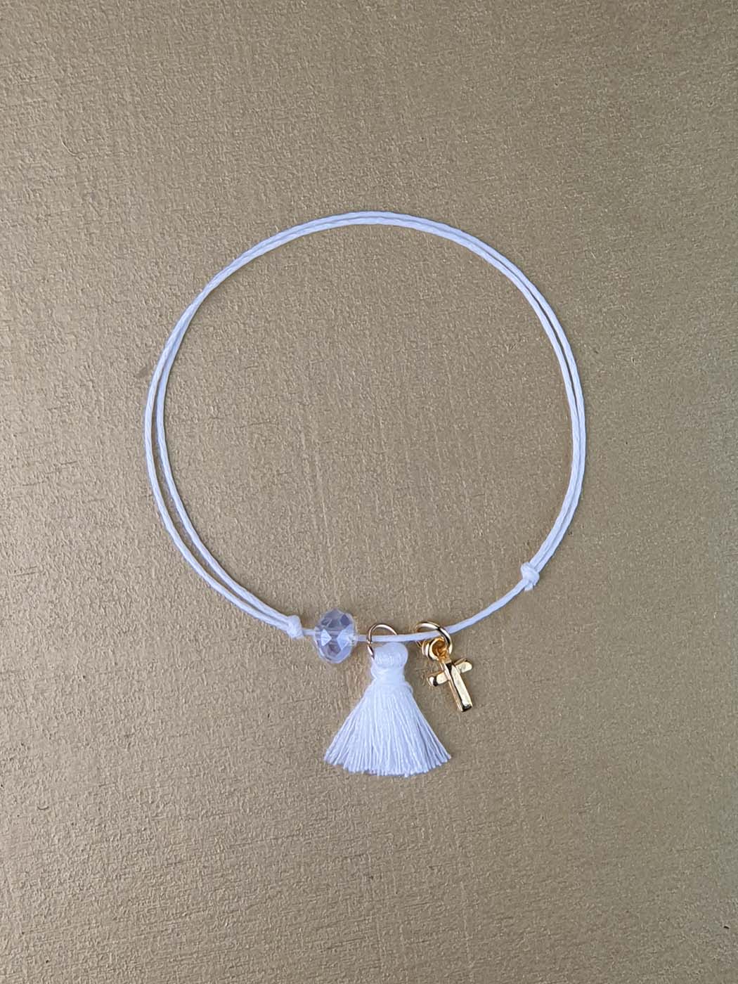 Χειροποίητο μαρτυρικό βραχιόλι βάπτισης DESIGNER'S CAT, με σταυρό σε χρυσό χρώμα διακοσμημένο με με λευκό φουντάκι.