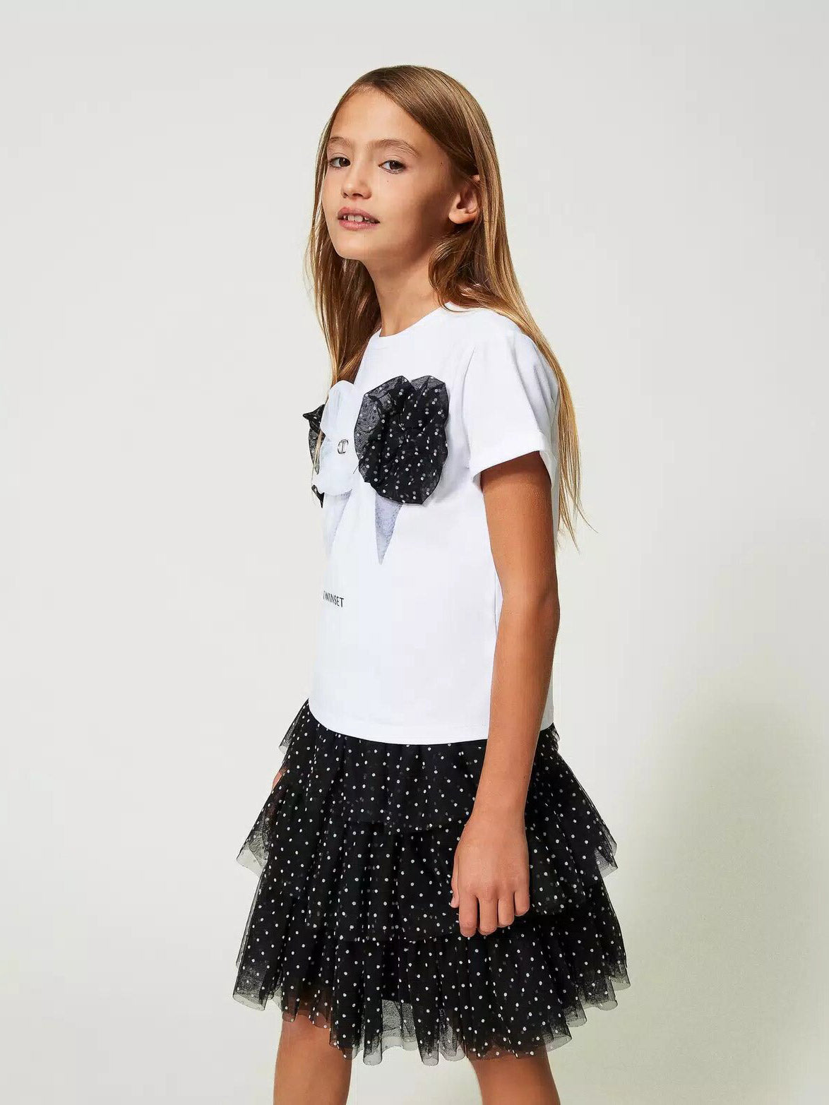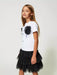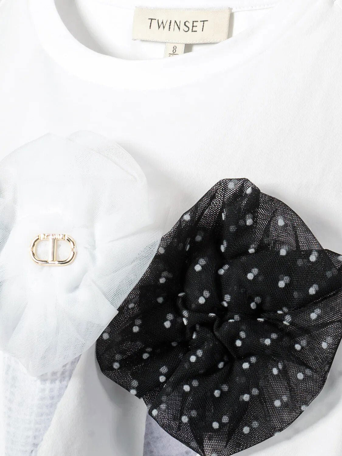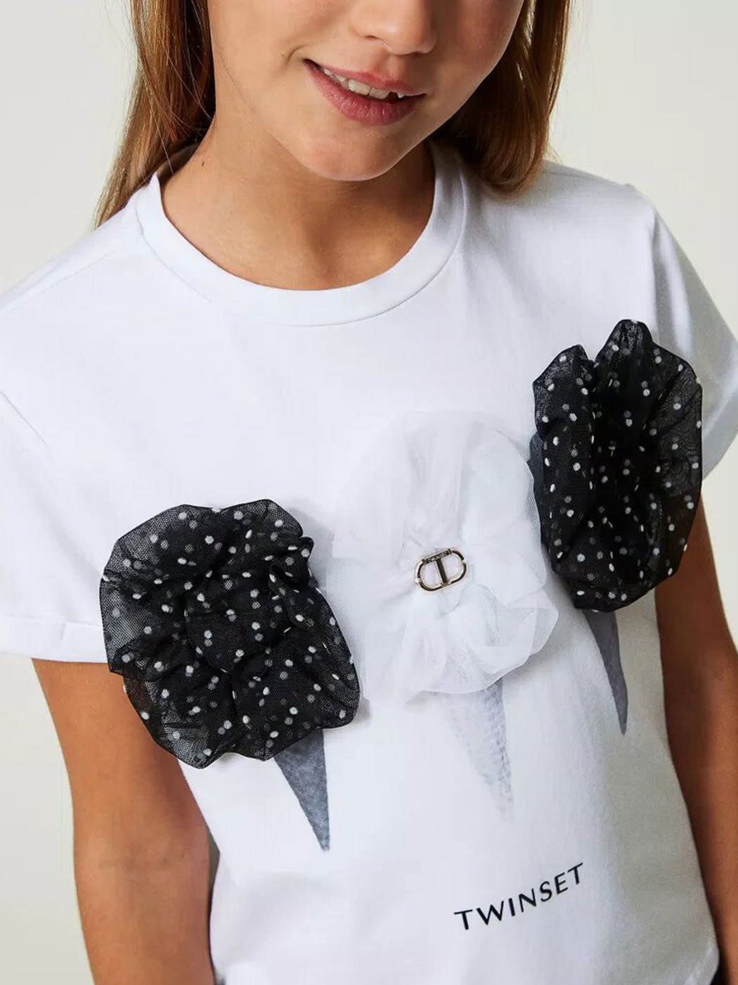 Εντυπωσιακό ελαστικό μπλουζάκι από βαμβακερό ζέρσεϊ με στάμπα «παγωτό», διακοσμημένο με πουά απλικέ τούλι.Είναι τέλεια επιλογή με ασορτί φούστα ή παντελόνι.
