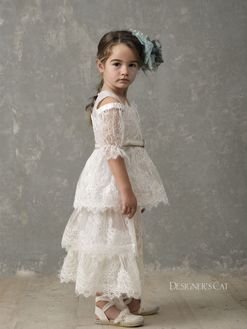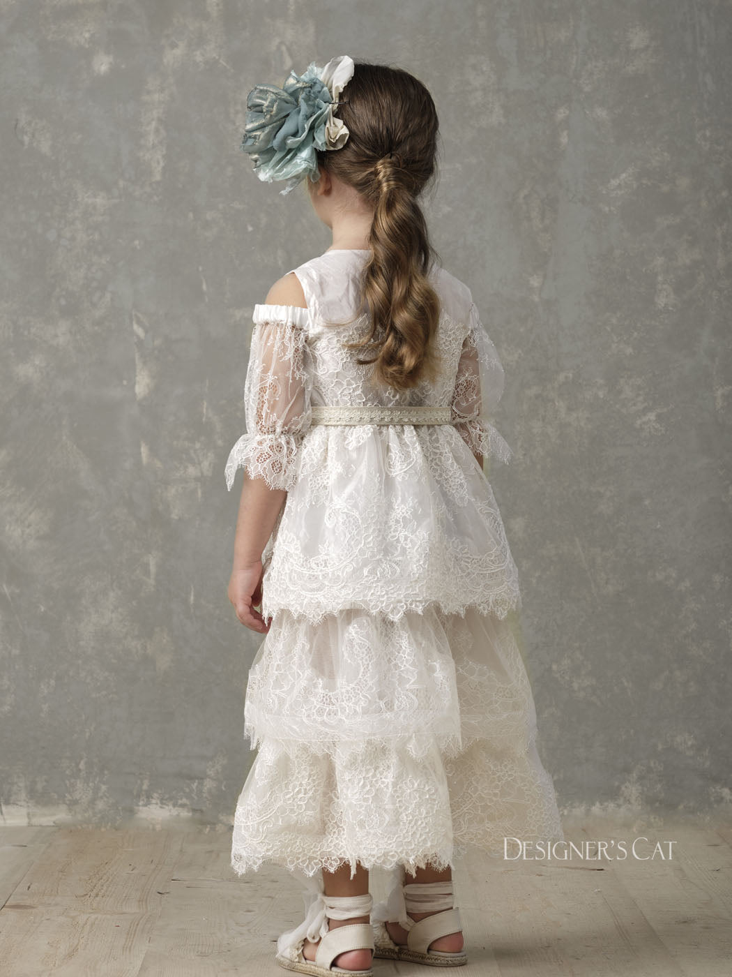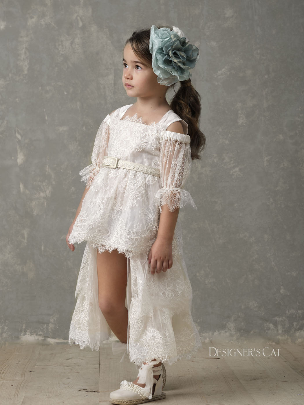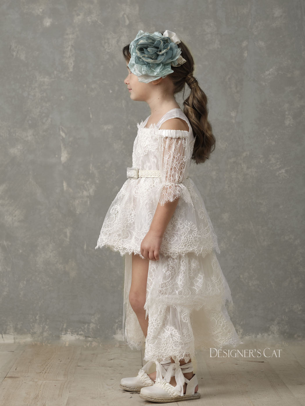 An Haute couture asymmetric dress with tail (short front), of high design, made of fine tulle with double Volant and lovely French "cordonnet" lace. Inner lining is 100% cotton. A beautiful high quality dress for special occasions, such as baptism and first communion.Amfitriti dress can be combined with matching hair accessories and shoes from the "Designer’s Cat Shoes" collection.