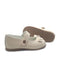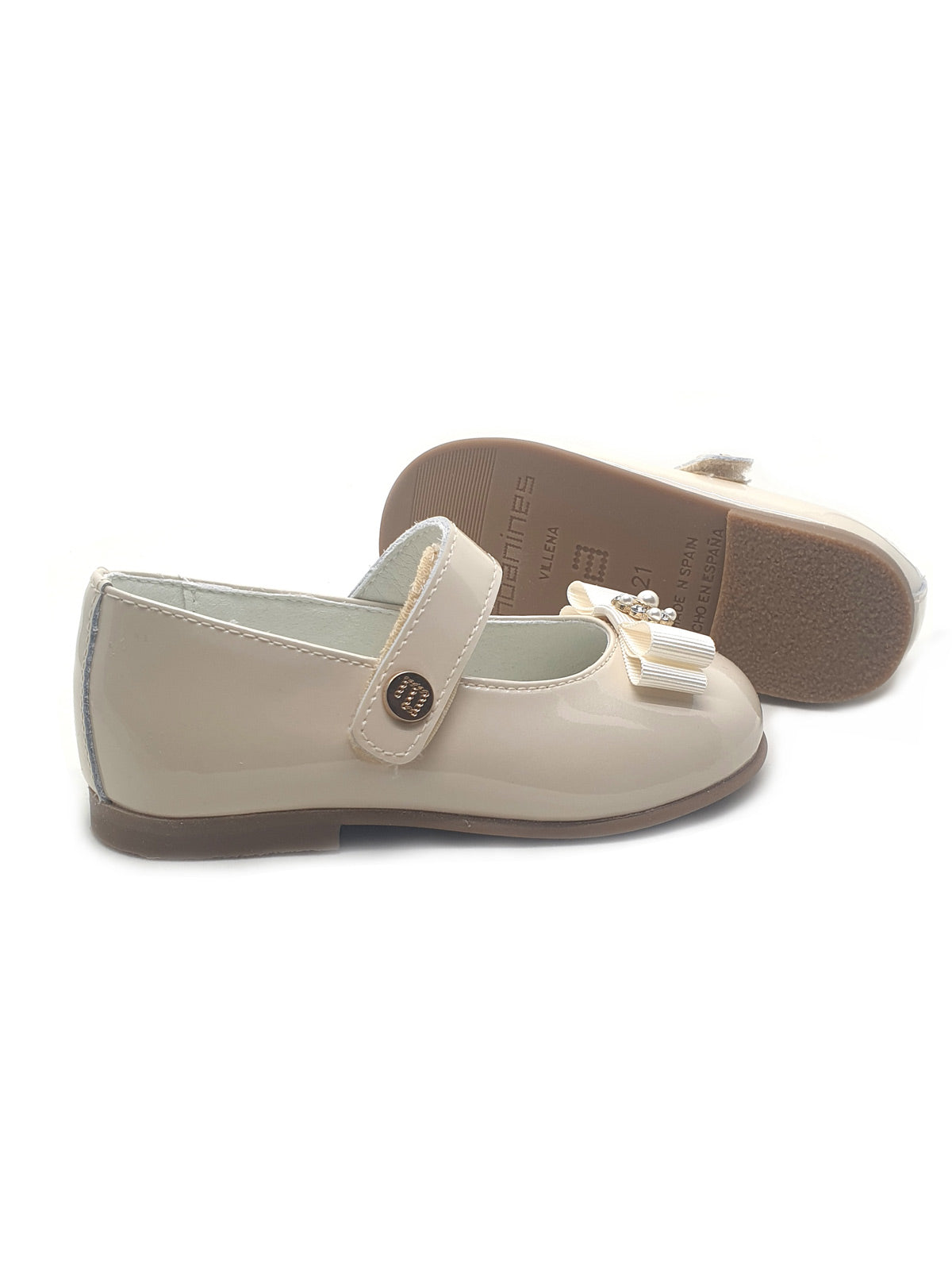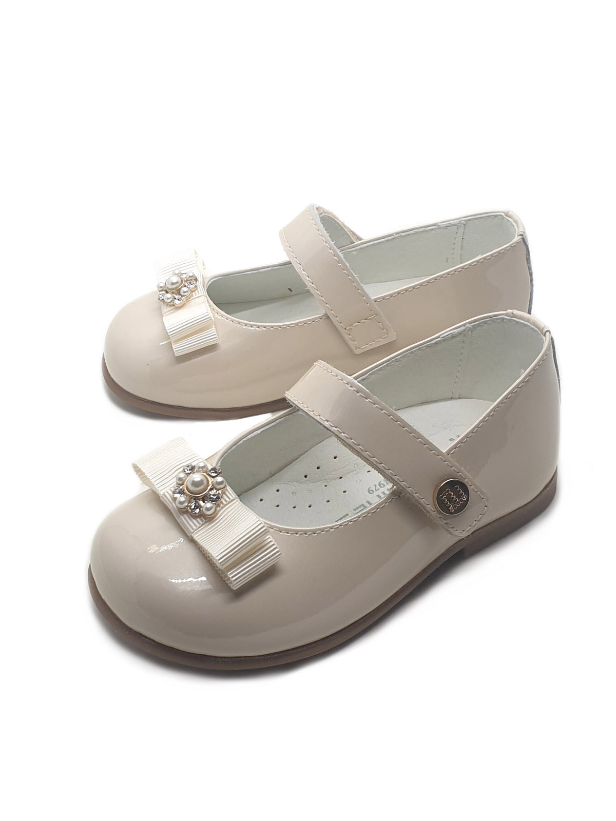 Leather ballerina shoe for girls from Andanines. These shoes are decorated with a bow and faux jewelry with pearls and rhinestones embellishment. They have a soft leather insole, feature a strap fastening, metallic finish and round toe. An ideal choice for special events.