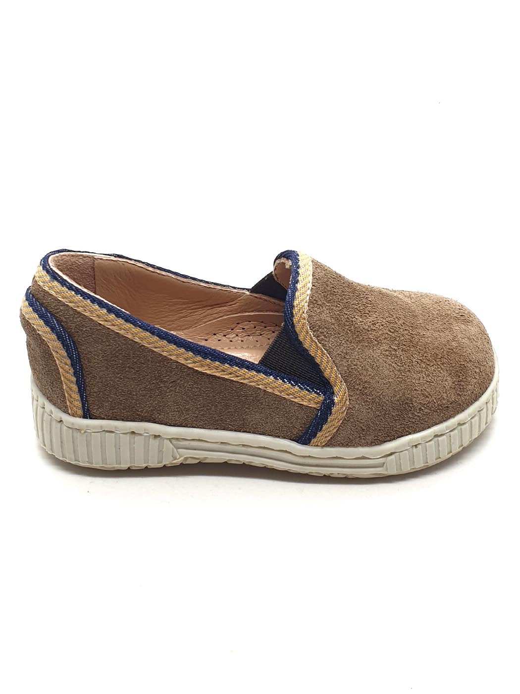 Suede shoe excellent quality with non-slip rubber sole for more steadily reinforced in the heel for better support of the foot. With leather lining respecting the anatomy of the foot, reinforced foam antibacterial material ARNEFLEX BREATHABLE. The inner lining is 100% skin to allow the foot to breathe. Available sizes: 20,21,22,23. Color: blue & beige.