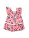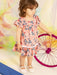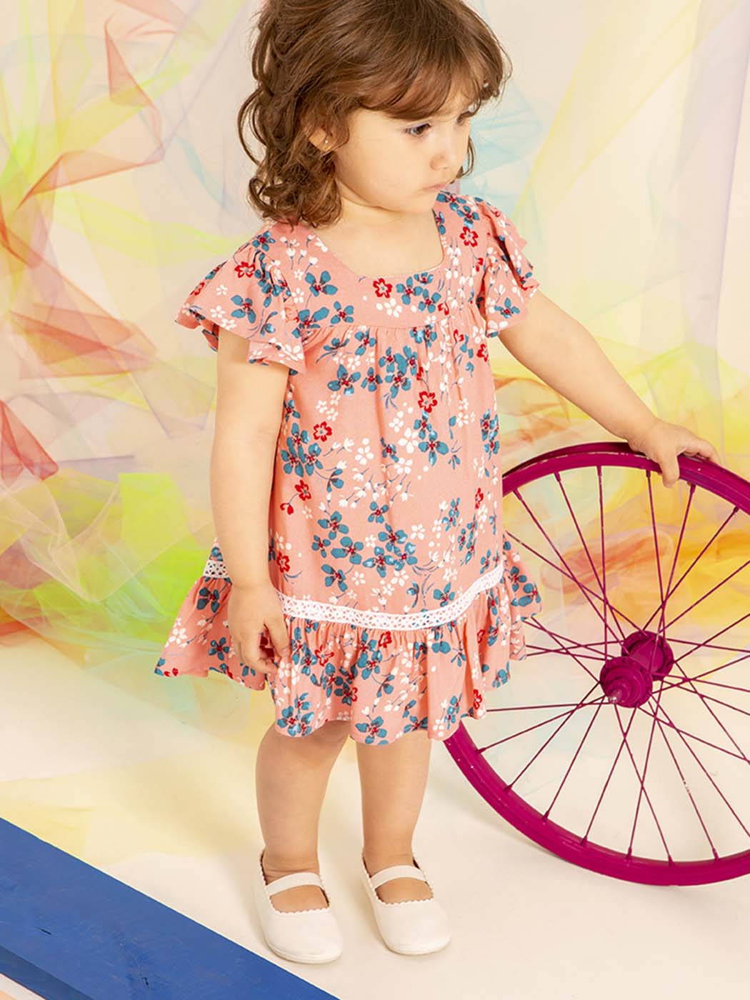 Baby dress with sleeve, made in soft viscose cloth decorated with a ruffles, trimmings and lovely print of small flowers.