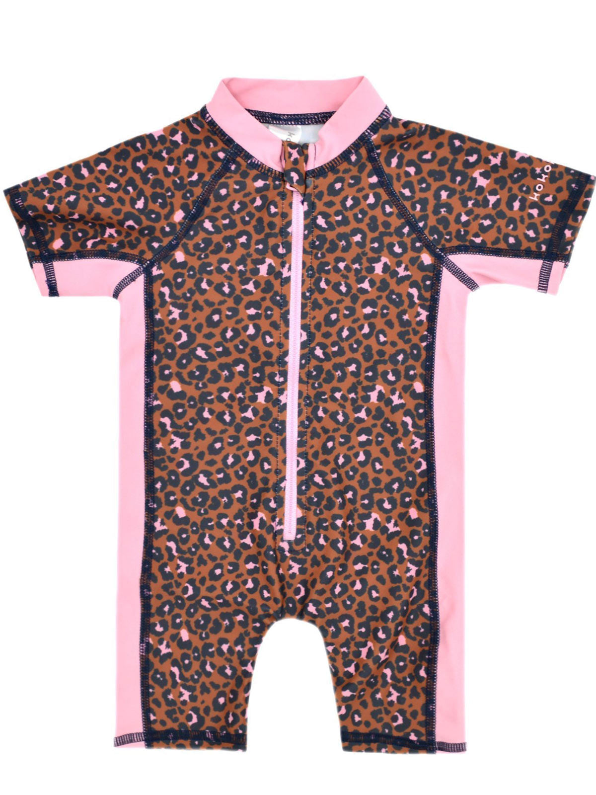 Coverall swimsuit for girl with an animal print all over. The suit has short sleeves and short legs. It opens at the front with a zipper with chin guard. The Swimsuit has a practical UV filter of 50+, so the kid will be well protected against the sun's harmful rays.