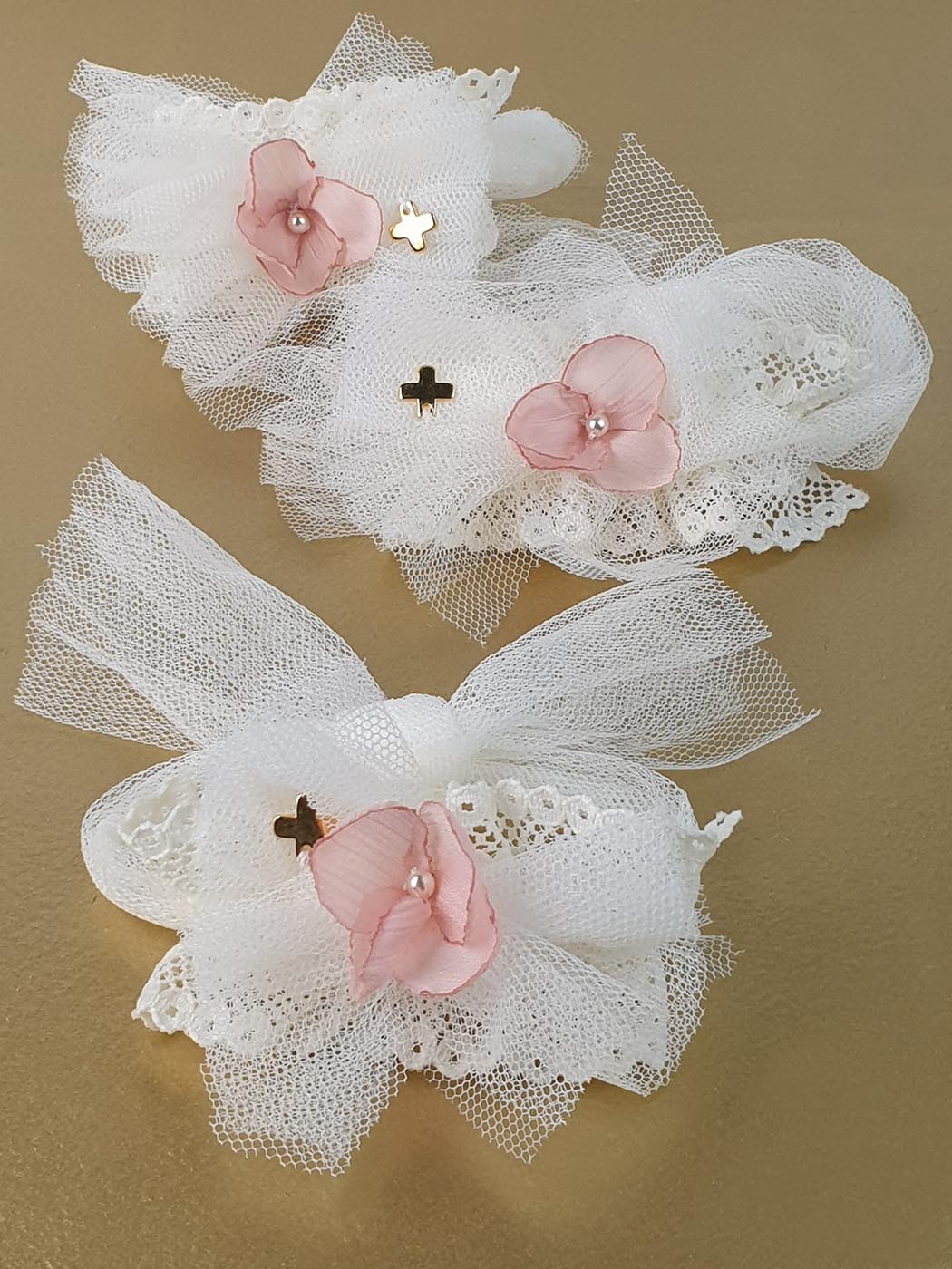 Handmade testimonial (Martyriko) tulle bracelet DESIGNER'S CAT, with cross in gold color decorated with lace, flower and pearl.