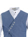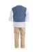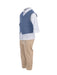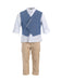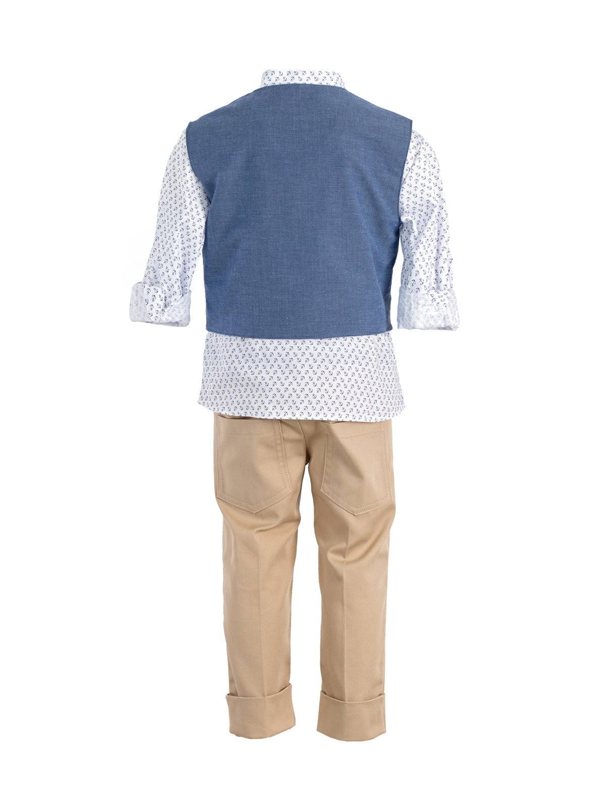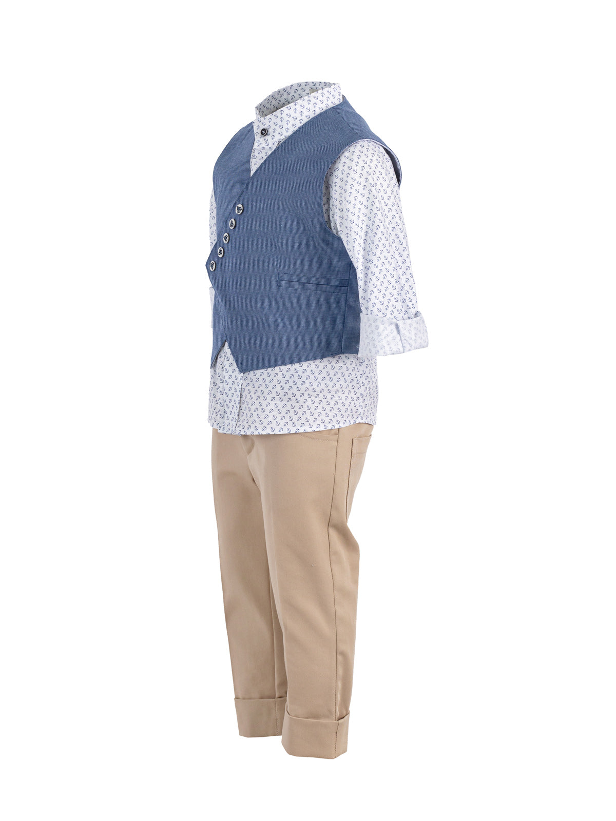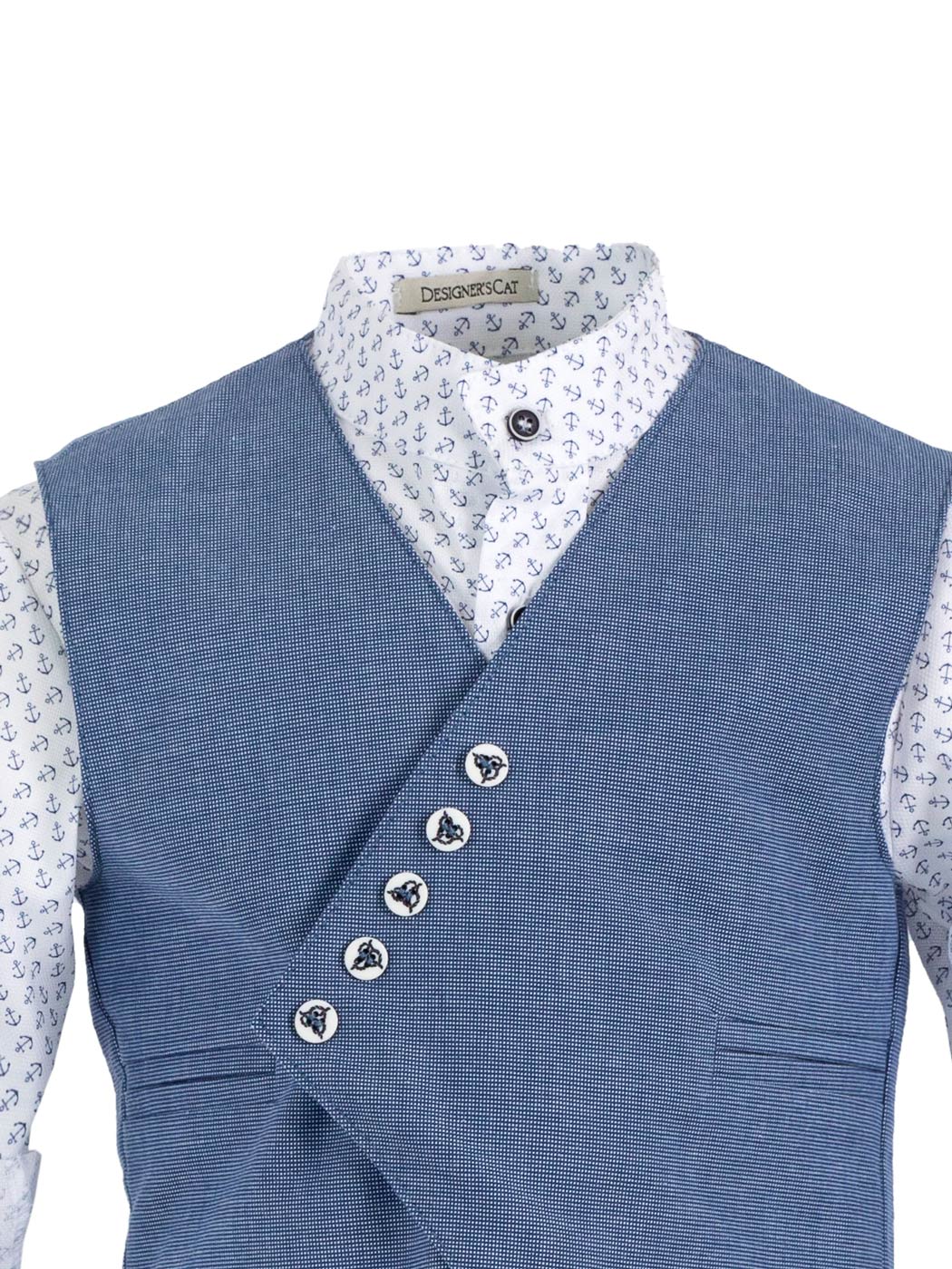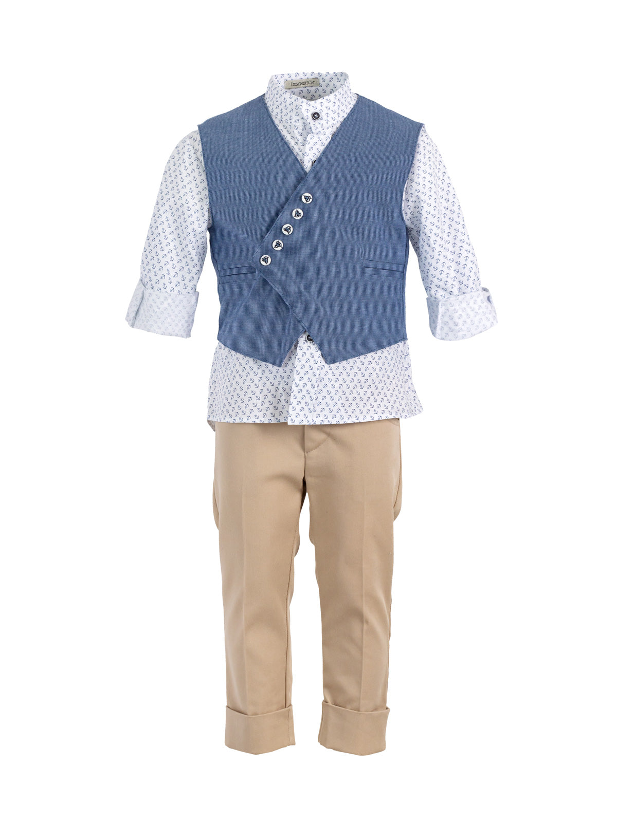Modern baptism outfit consisting of cotton trousers and asymmetrical double-breasted waistcoat, cotton print shirt in “Mao” style, belt and hat. A perfect choice for special events.