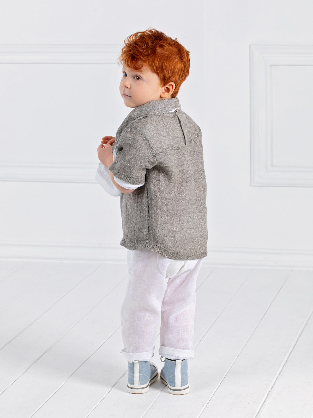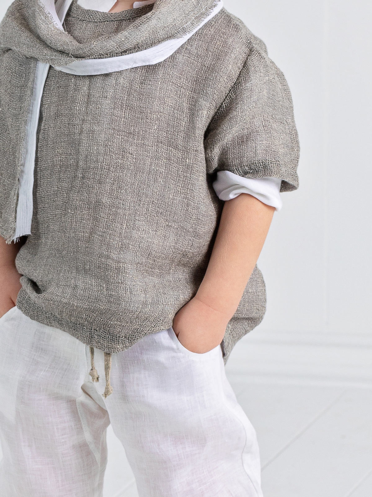 Boy's outfit set 5 pcs made of 100% linen, consisting of Jogging pants with link drawstring, lovely loose linen shirt, knitted blouse and scarf in the color of sand. The set is completed with a matching hat.