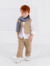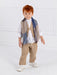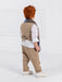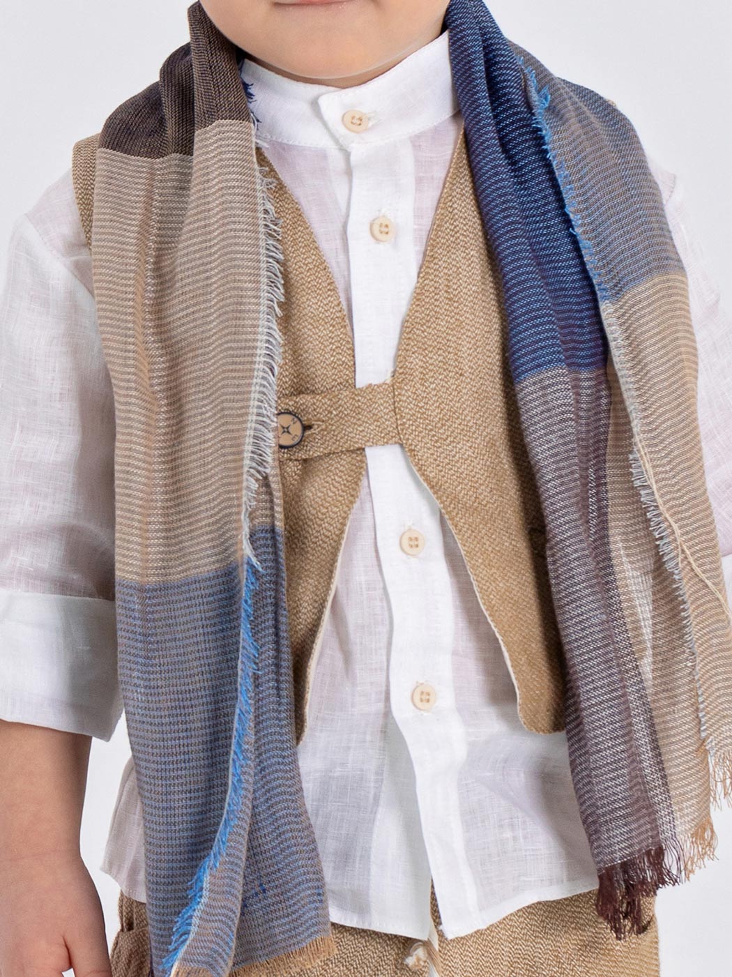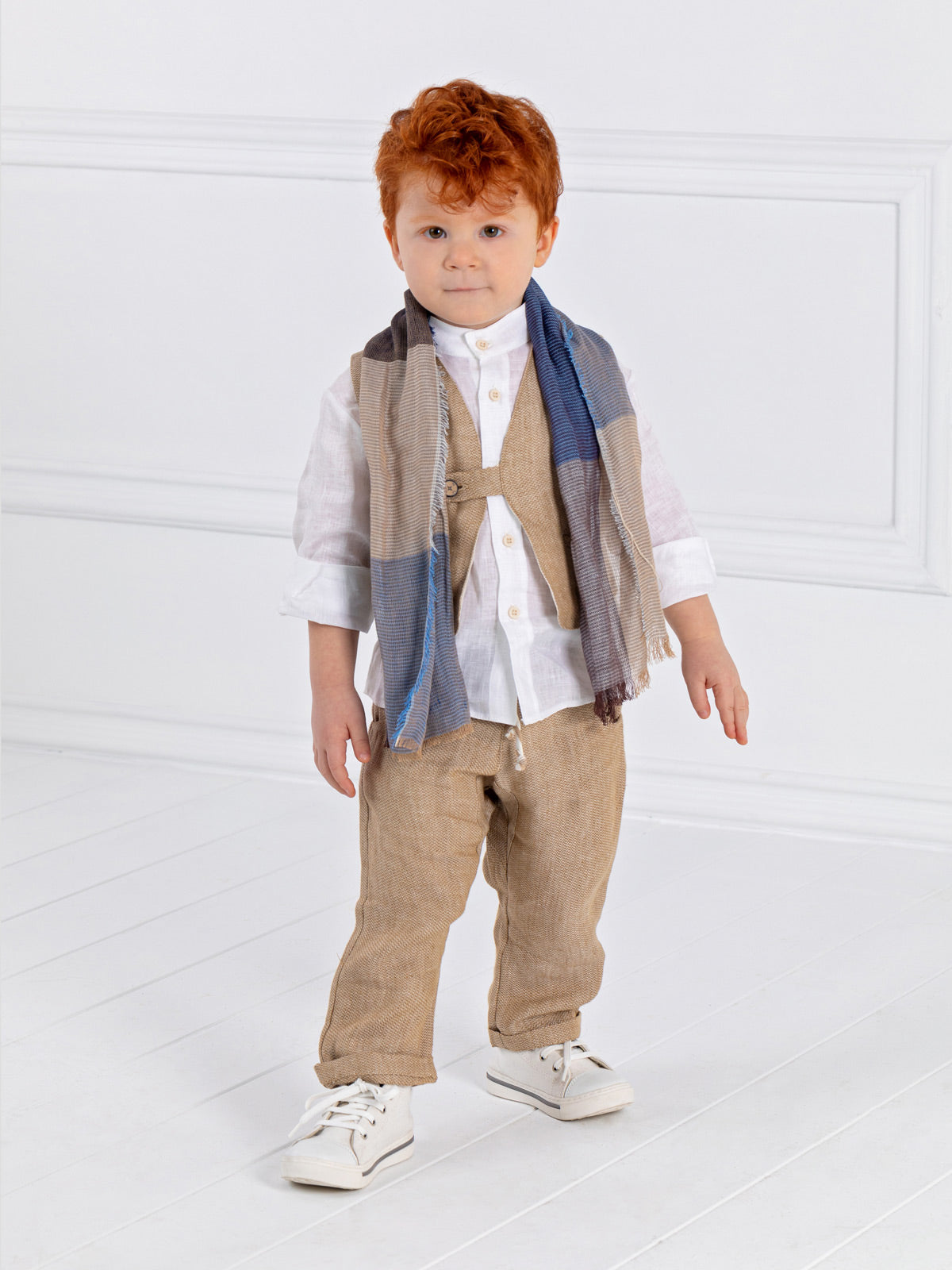 A unique comfortable total in bohemian style. Boy's outfit set 5 pcs made of 100% linen, consisting of Jogging pants with link drawstring, lovely linen vest with one button and linen "Mao" white shirt. The outfit is completed with a matching checkered scarf and hat. A perfect choice for special events, but also for casual looks.