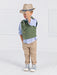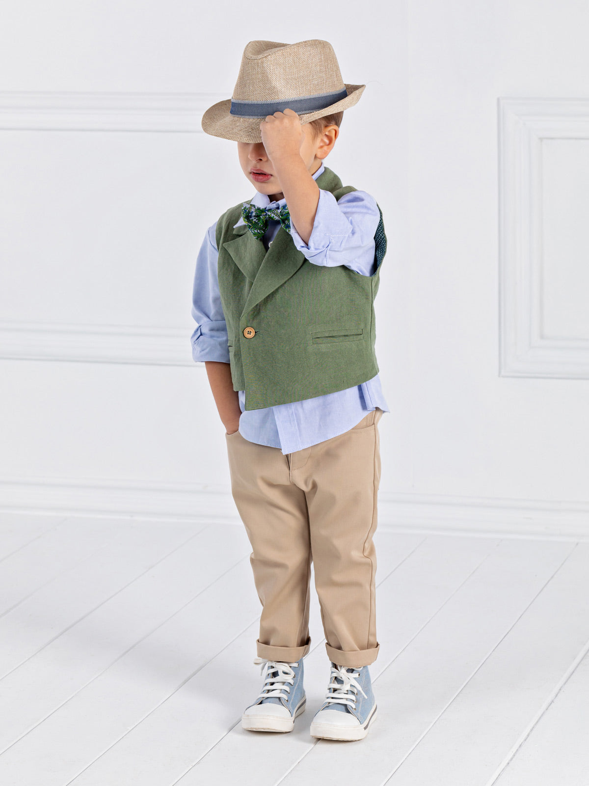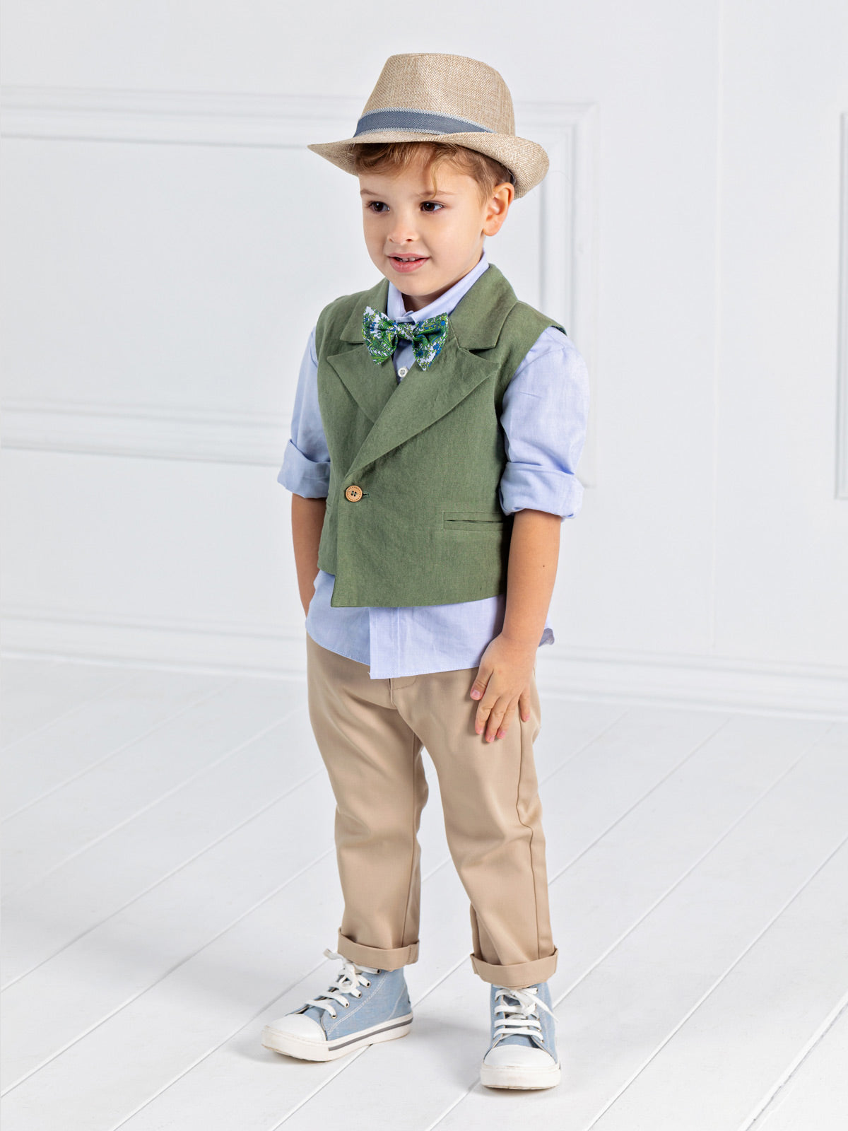 Italian style outfit consisting of cotton trousers in regular line, mélange cotton (yarn-dyed) shirt, a linen asymmetric vest matching with lovely bow. The outfit is completed with a matching hat and belt.