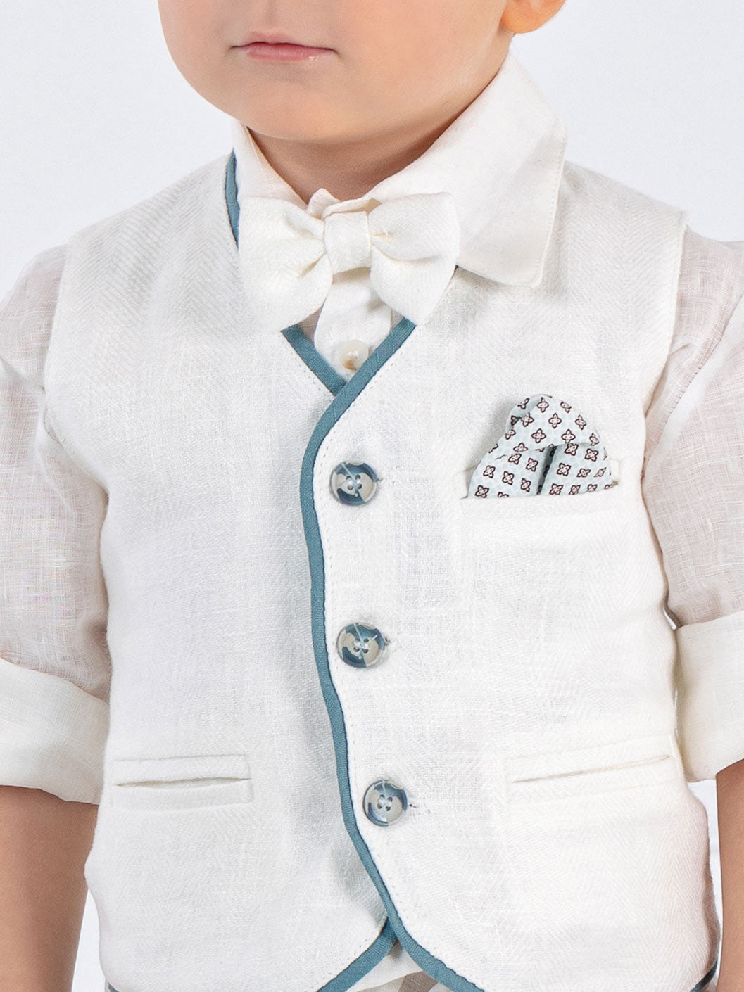 Fashionable Baptism set 7 pcs for boy, made of high quality Belgium jaquard linen fabric. Modern trousers and shirt in regular line, vest decorated with wonderful buttons. The set is completed with a white lovely bow, matching hat and decorative handkerchief.