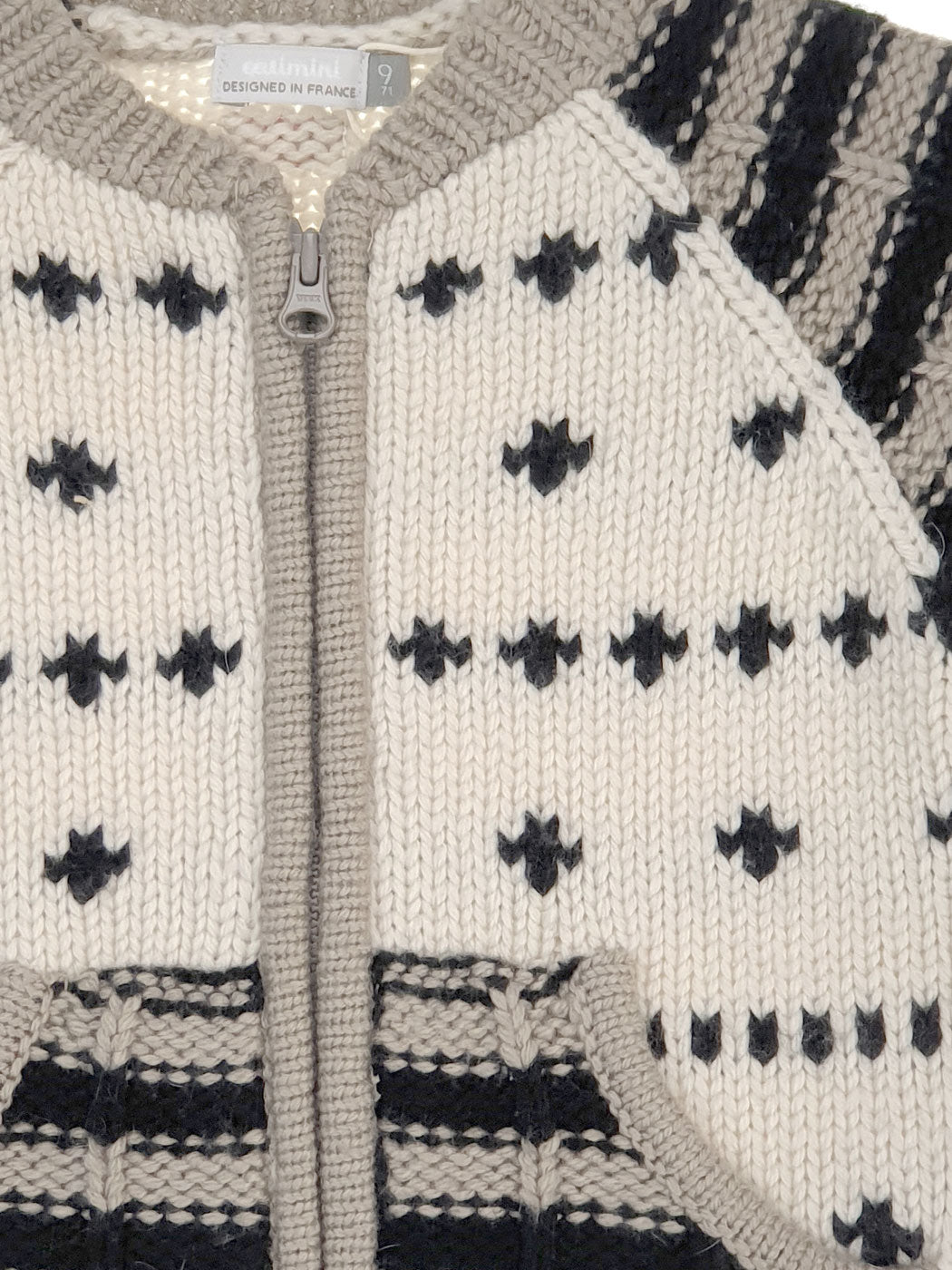 Baby boy's Knitted cardigan with zipper on the front, in sweet beige color decorated with lovely motifs. Ideal choice for the for the cooler days.