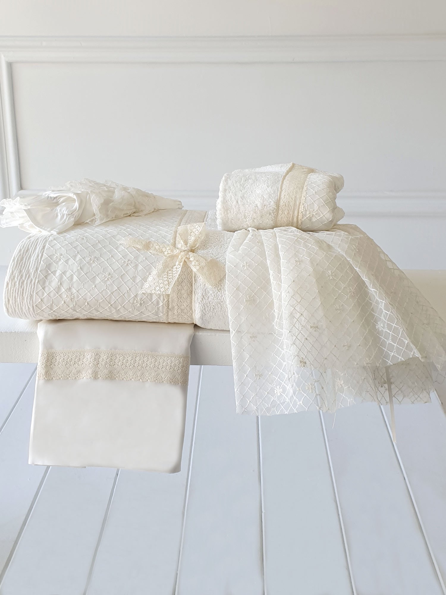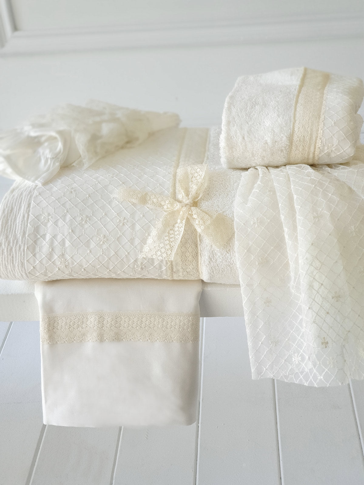 Christening underwear set 6 pieces, made of embroidered tulle with embossed patterns, including 2 excellent quality fluffy towels (100% Egyptian combed cotton 600gr/m2), 1 sheet and 3 pieces of underwear from 100% combed cotton.