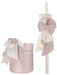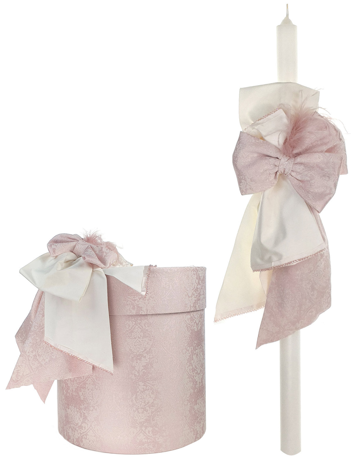 Christening candle Designer's Cat, decorated with a lovely maxi bow and decorative glass stones in sweet pink color. It is combined with matching dress and baptism accessories.