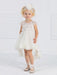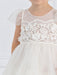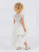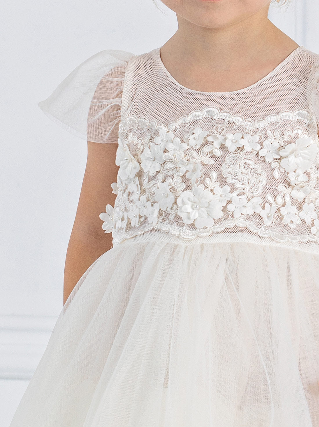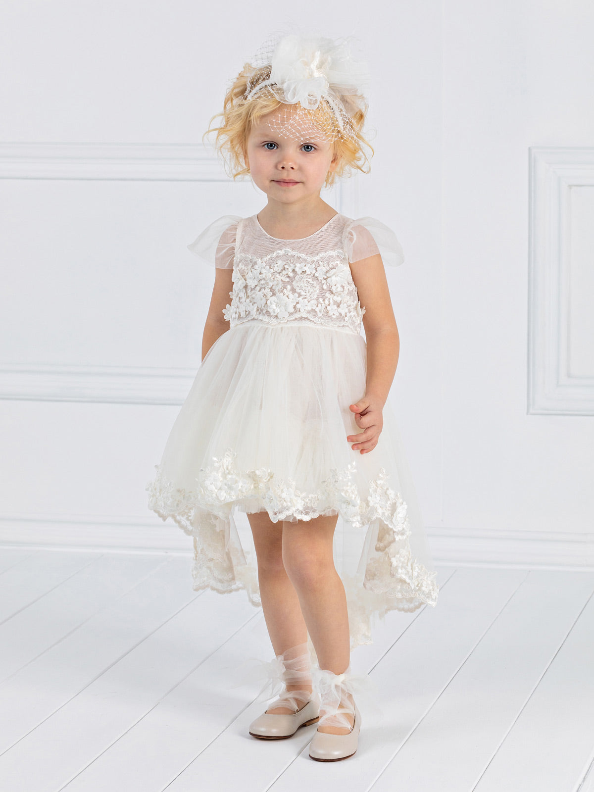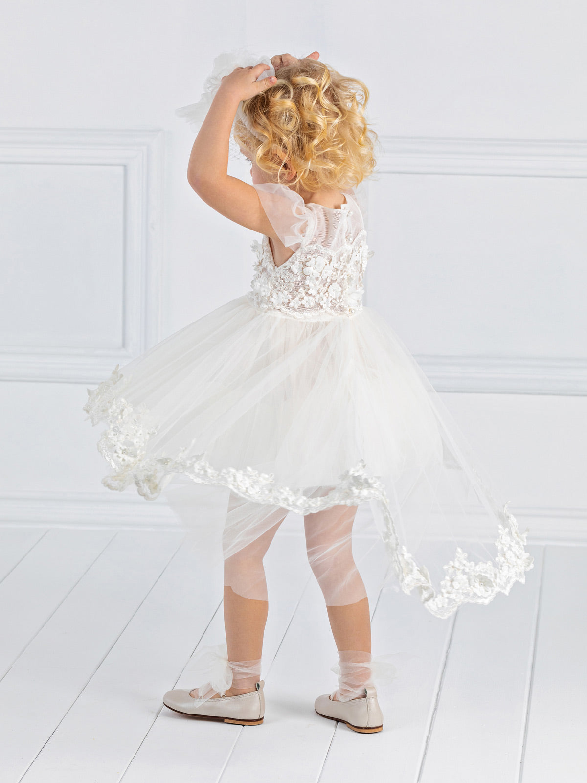 Haute couture asymmetric dress, with tail short front and long back. Bust made of fine cotton tulle and special French lace, round neck and short tulle sleeve. Inner lining is 100% cotton. It can be combined with matching hair accessories. A beautiful dress for special occasions.
