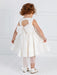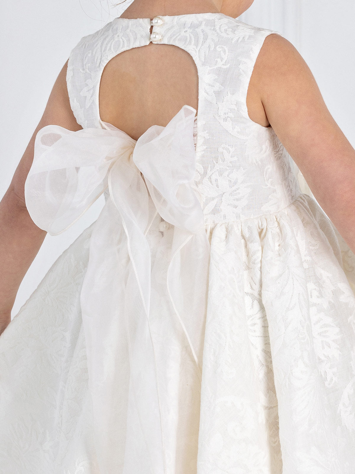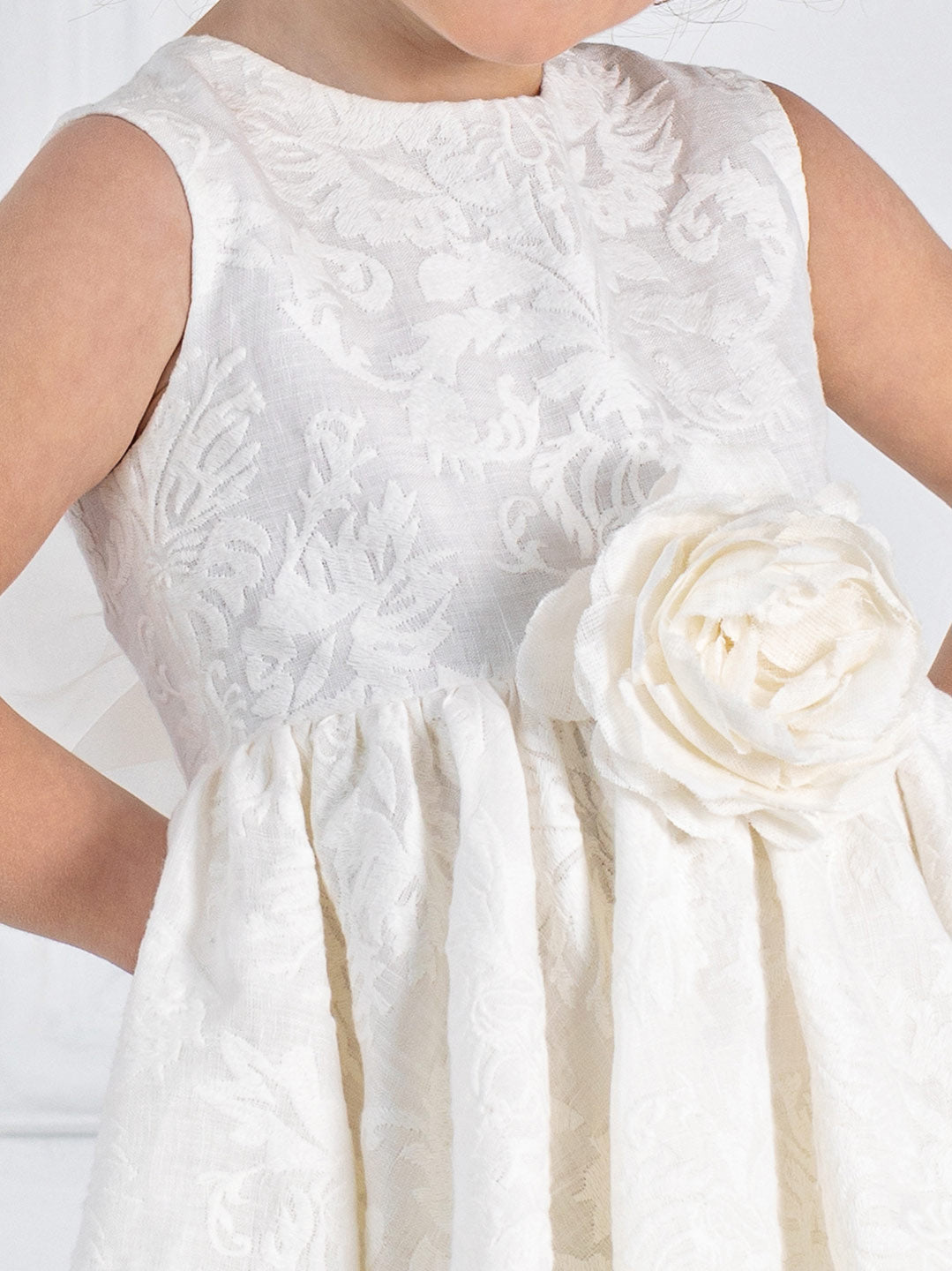 A romantic backless dress made of 100% jacquard linen, sleeveless with round neck, decorated with muslin maxi bow at the back and beautiful flower at the front. Inner lining is 100% cotton. An excellent choice for the day of baptism and also for special events.