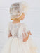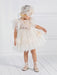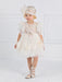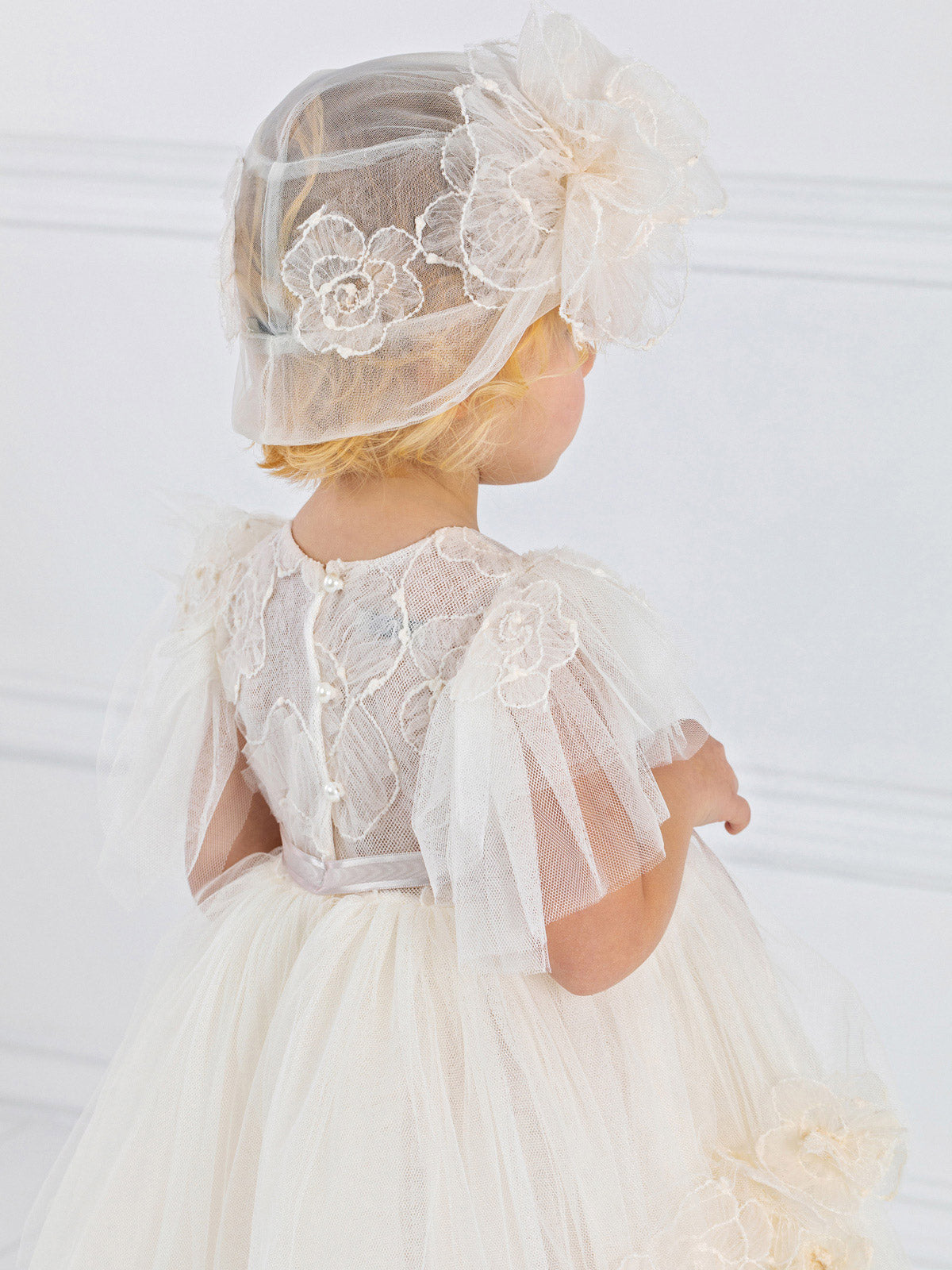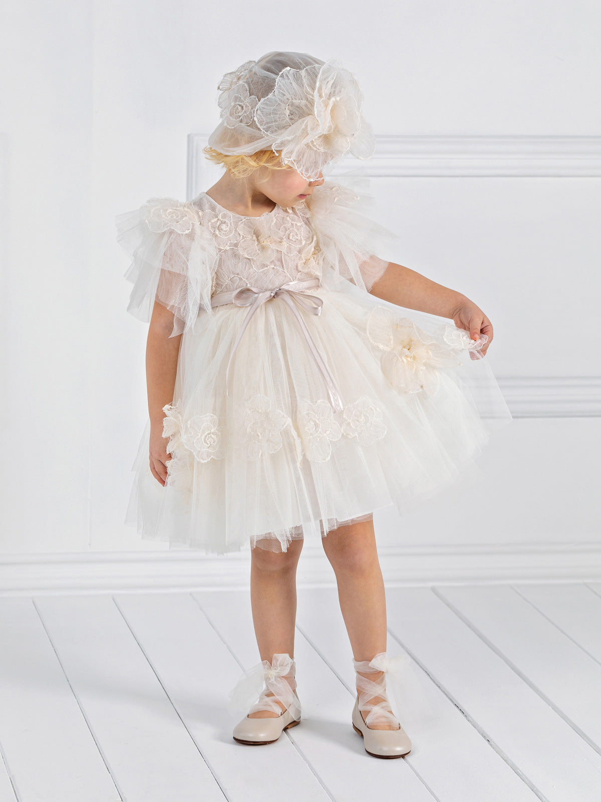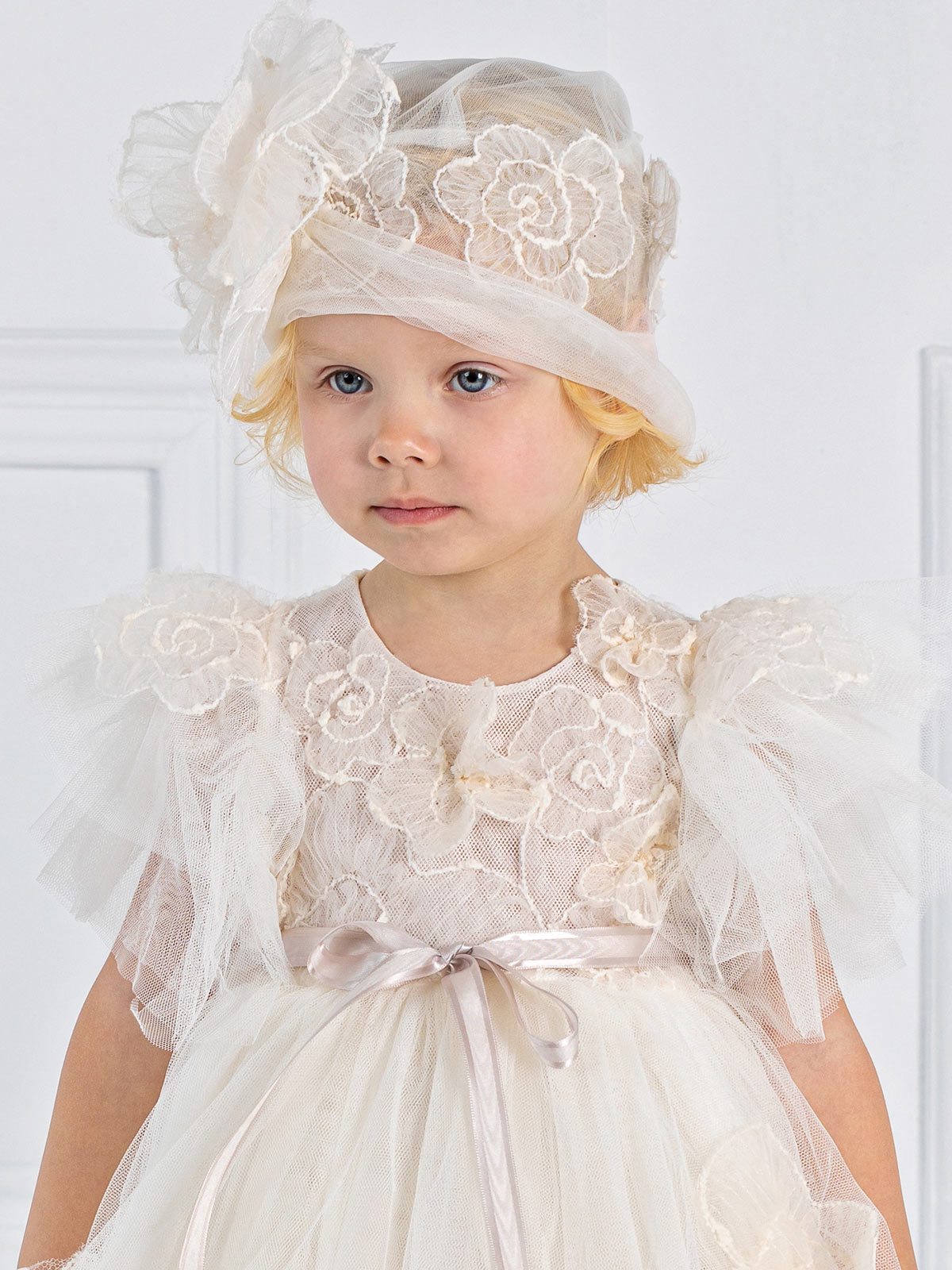 Romantic dress, with lovely gathered tulle sleeves, round neck, applique patterns of pleated tulle on the chest and skirt. The outfit is completed with a beautiful satin ribbon at the waist. It can be combined with matching hat or headband. An ideal choice for the baptism and other special occasions.