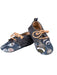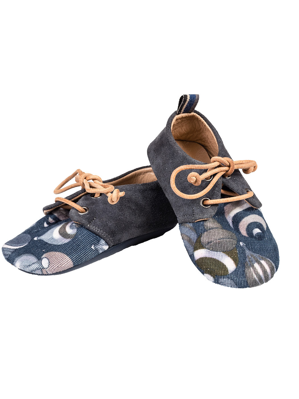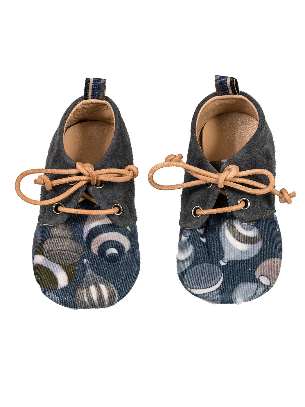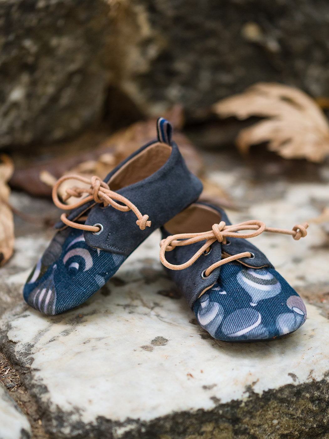 Modern crib shoes made entirely of excellent quality leather in the inner lining, insole and outsole. External lining is 100% cotton with a discreet thread painted star pattern. Available in two lovely colours, green-beige and pink-blue. Designed for special events such as a baptism, celebrations or birthdays, as well as for casual occasions. They match perfectly with outfits for boys from the DESIGNER'S CAT collection and are available in 16-17 and 18-19 sizes.