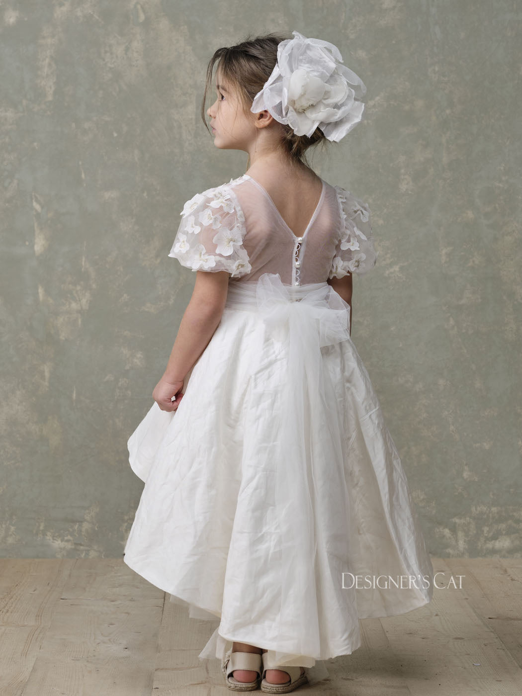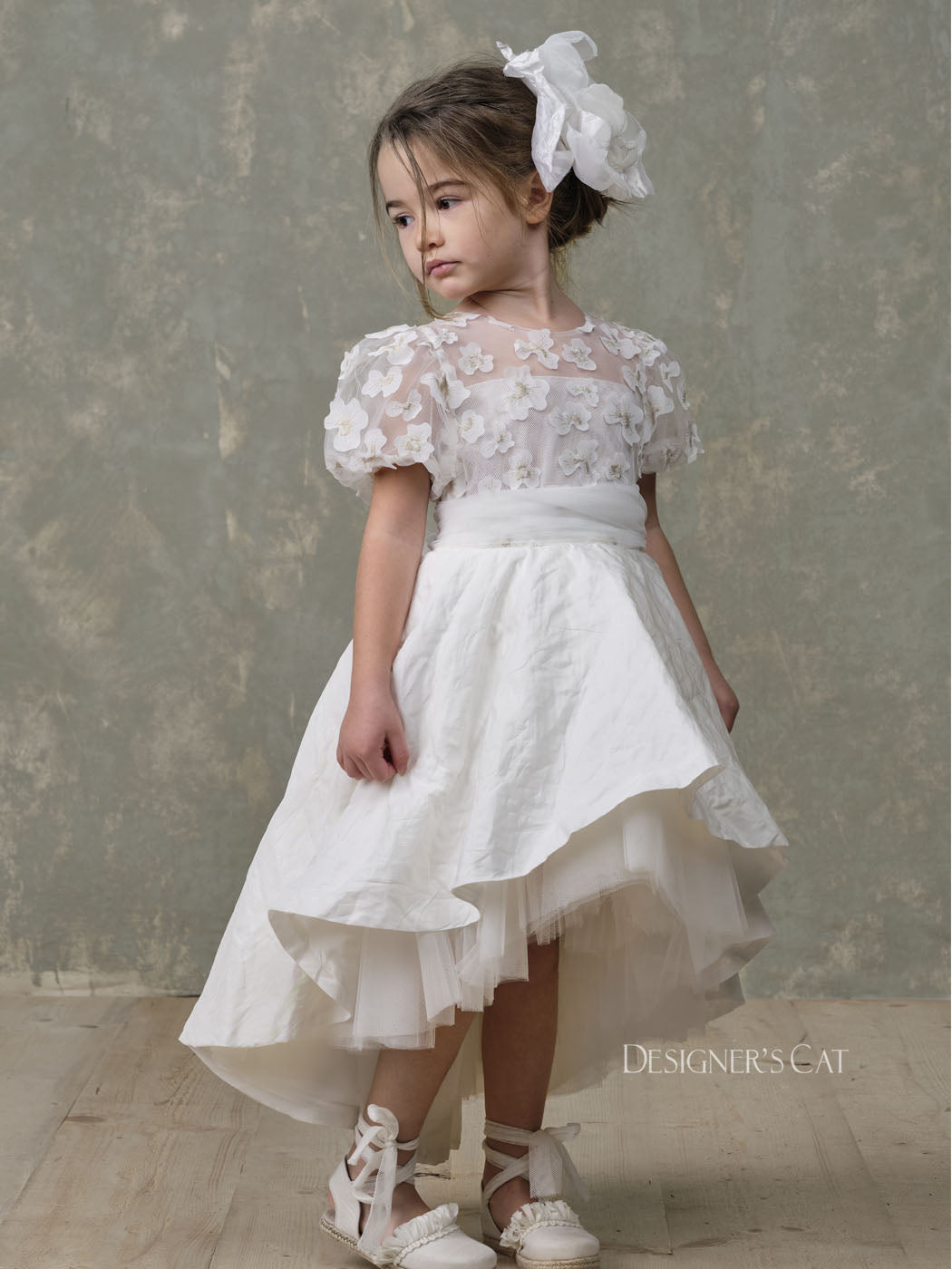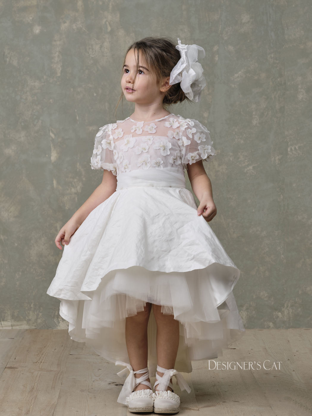 An elegant asymmetric dress with sleeve, made of excellent silk fabric and fine tulle decorated with lovely appliqué 3D motifs. Impressive outfit for special occasions. Inner lining is 100% cotton. Erofili dress can be combined with matching hair accessories and shoes from the "Designer’s Cat Shoes" collection. Available sizes: 1 to 12years old. Color: ivory